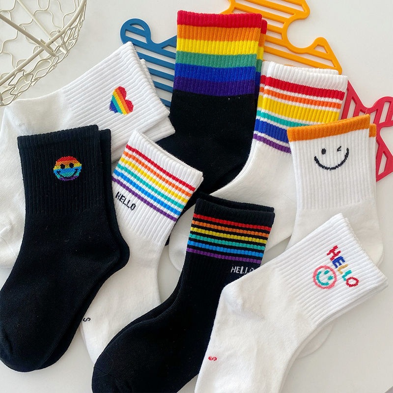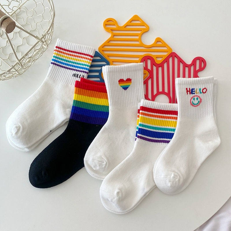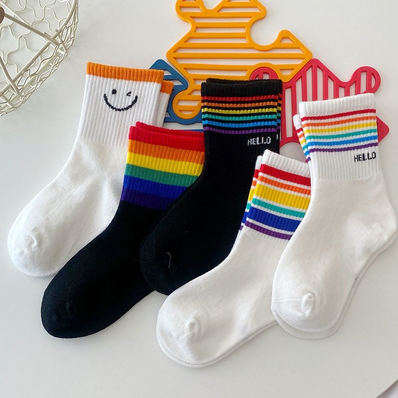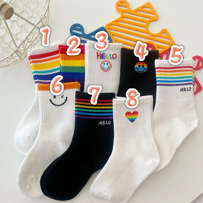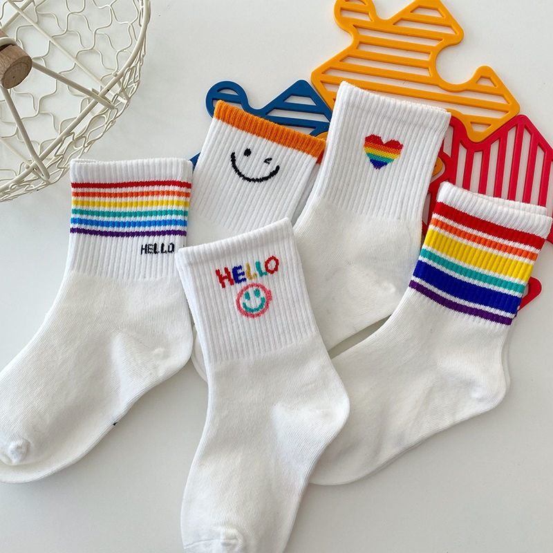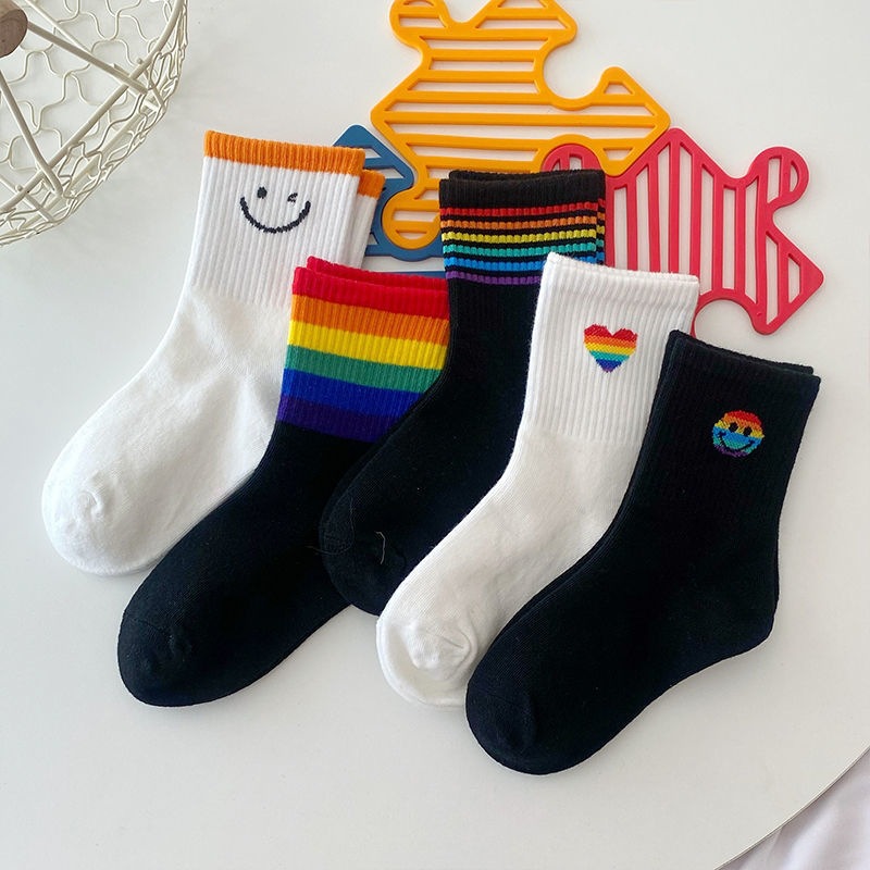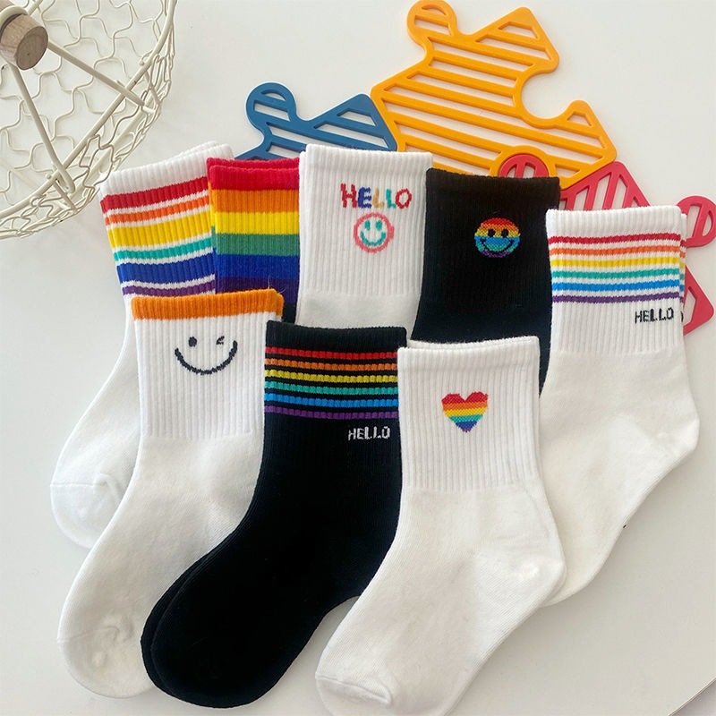 무지개 어린이 양말 봄과 여름 얇은 대형 작은 어린이 소년과 소녀 스포츠 스마일 사랑 흑백 면 양말