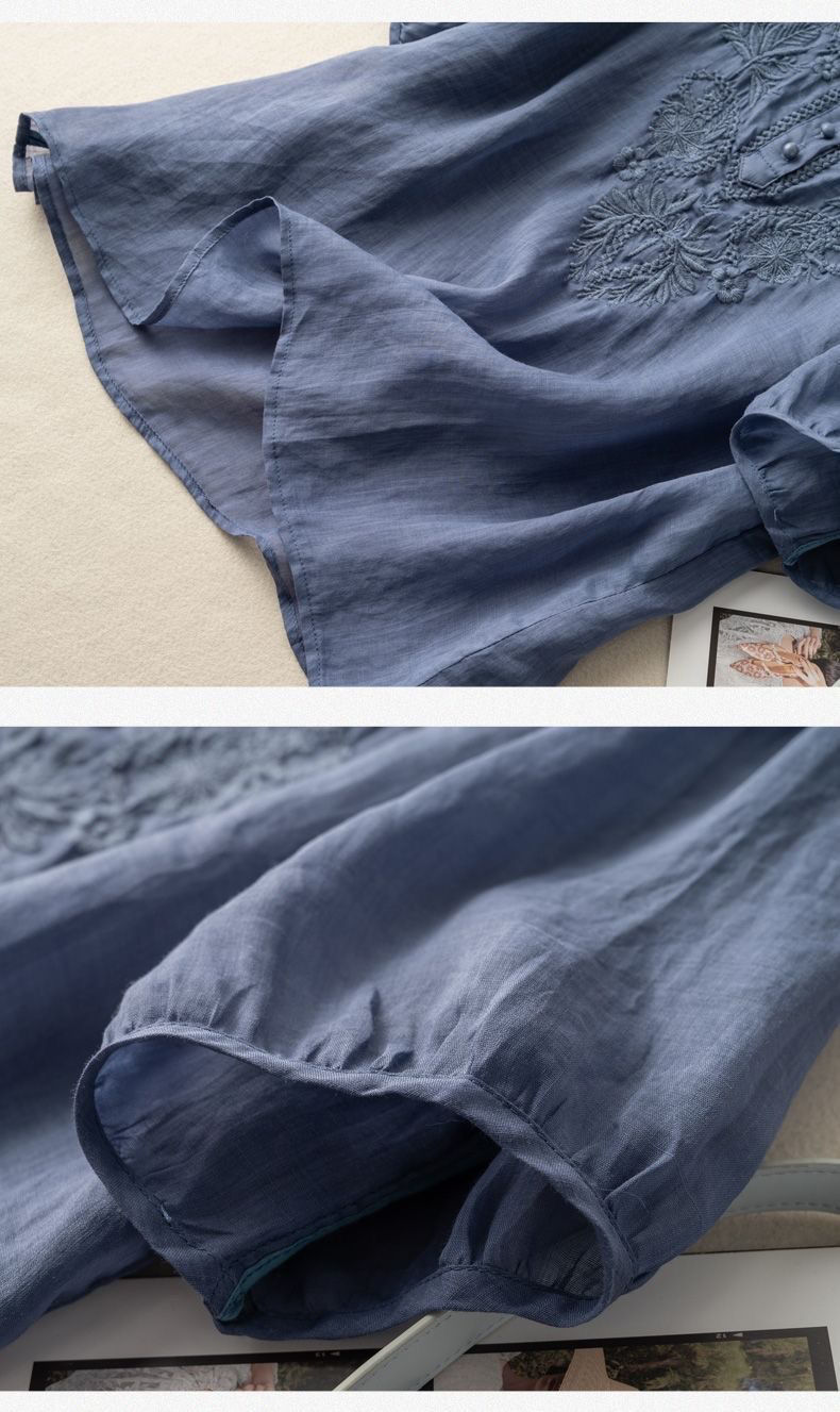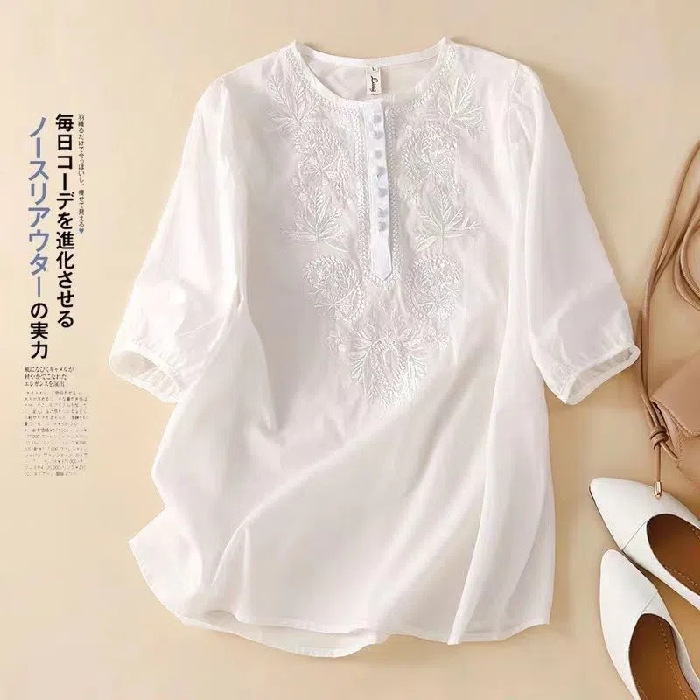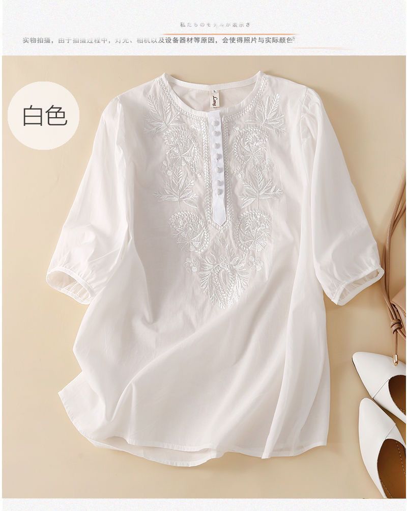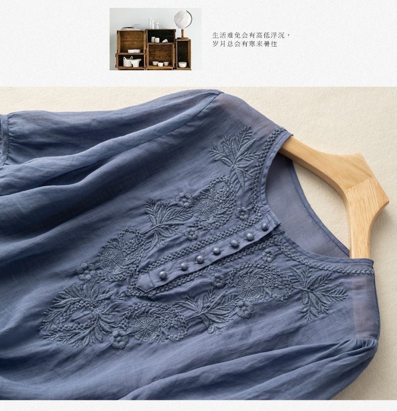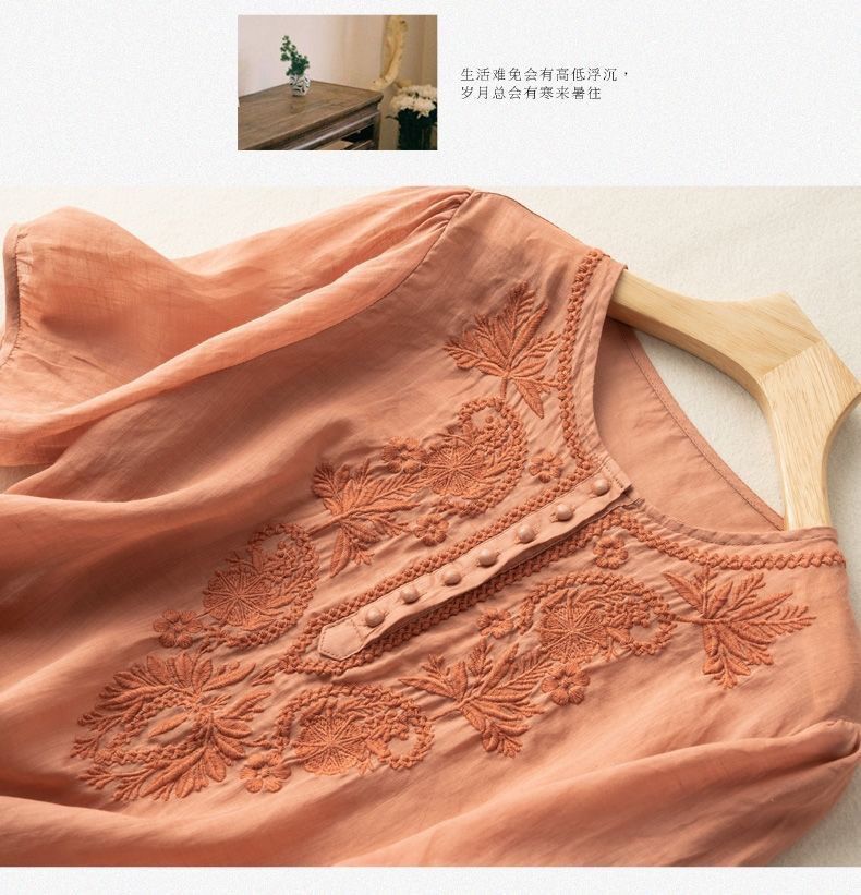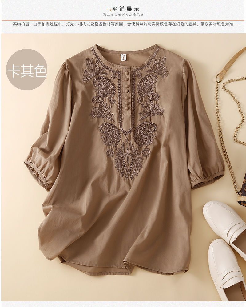 대외 무역 수출 외국 스타일 여름 새로운 느슨한 슬리밍 크루넥 티셔츠 여성의 예술적 단색 자수 면과 린넨 탑