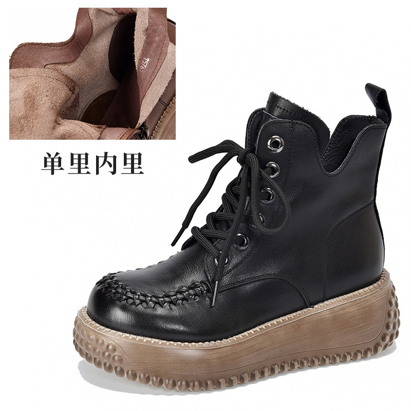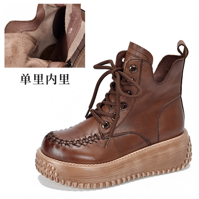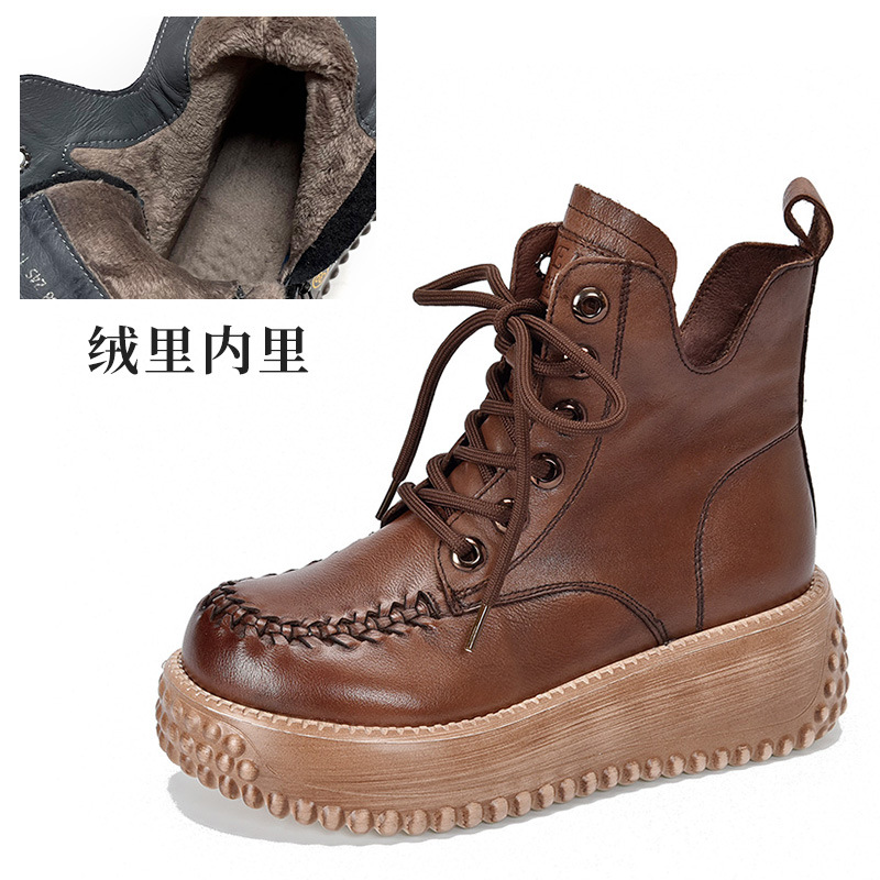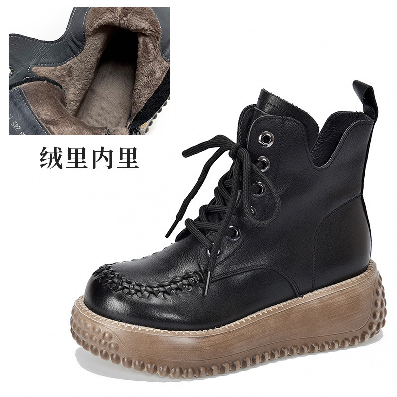 【 9.9kg 켤레】 여성용 천연 가죽 마틴 부츠, 벨벳 안감 면 부츠, 소가죽 라운드 토 두꺼운 밑창 레트로 플랫폼 숏부츠스토어 가기