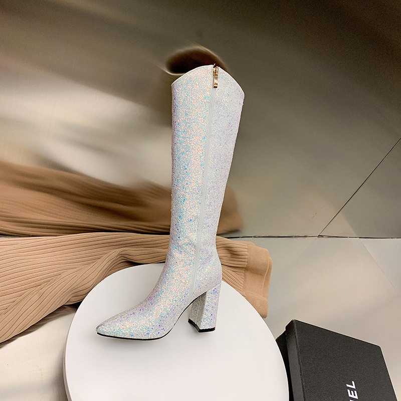 32-43 사이즈 여성 부츠 해외 무역 크로스 보더 여성 부츠 2022 가을과 겨울 새로운 뾰족한 하이힐 부츠 스팽글 하이 부츠