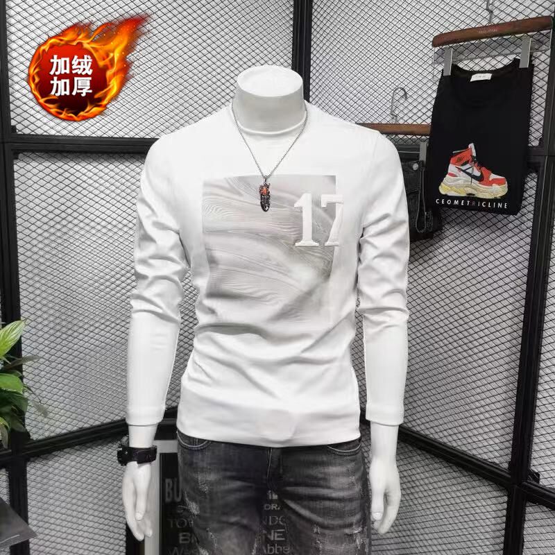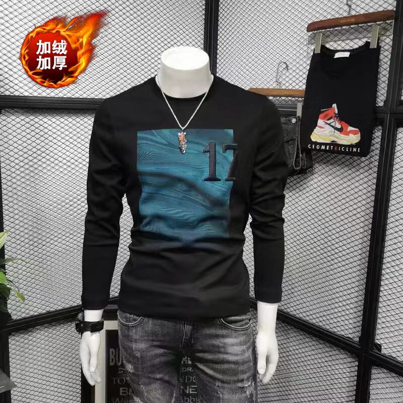 유럽 역 가을과 겨울 남성 기모 두꺼운 긴팔 티셔츠 라운드 넥 인쇄 트렌디 슬림 핏 티셔츠 언더 셔츠