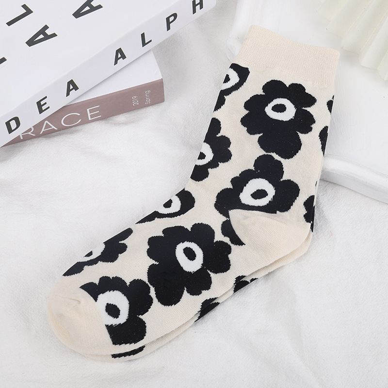 새로운 미니멀리스트 흑백 패턴 디자인 귀여운 소면 양말 미드 배럴 트렌드 캐주얼 양말 도매스토어 가기