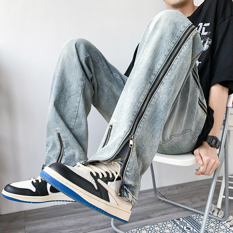 듀플렉스 핸섬 청바지 남성용 사이드 지퍼 아메리칸 스타일 하이 스트리트 디자인 센스 스플릿 스트레이트 팬츠 여름 트렌디 브랜드 인 팬츠