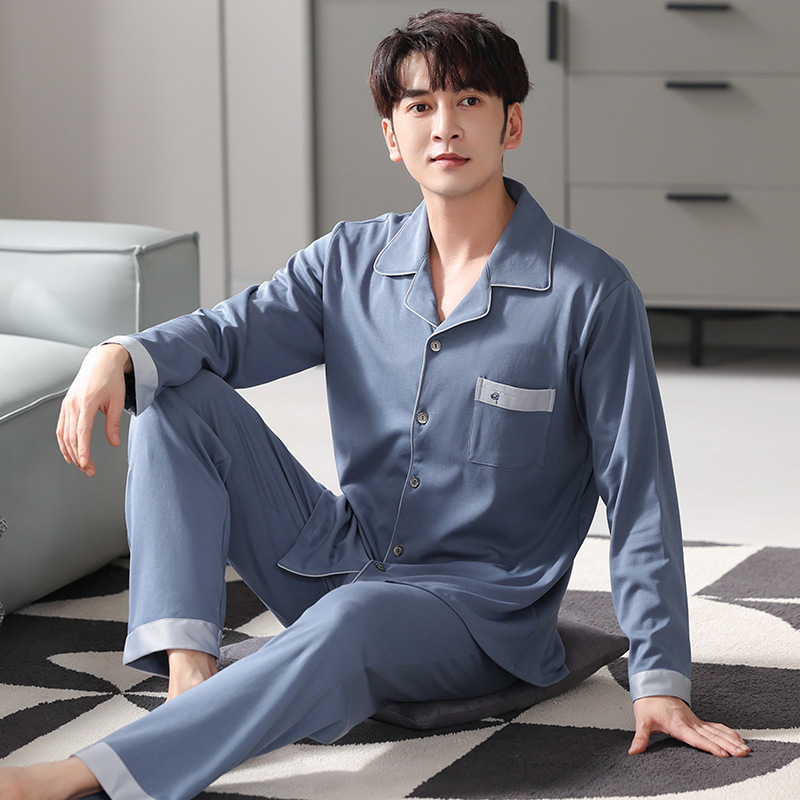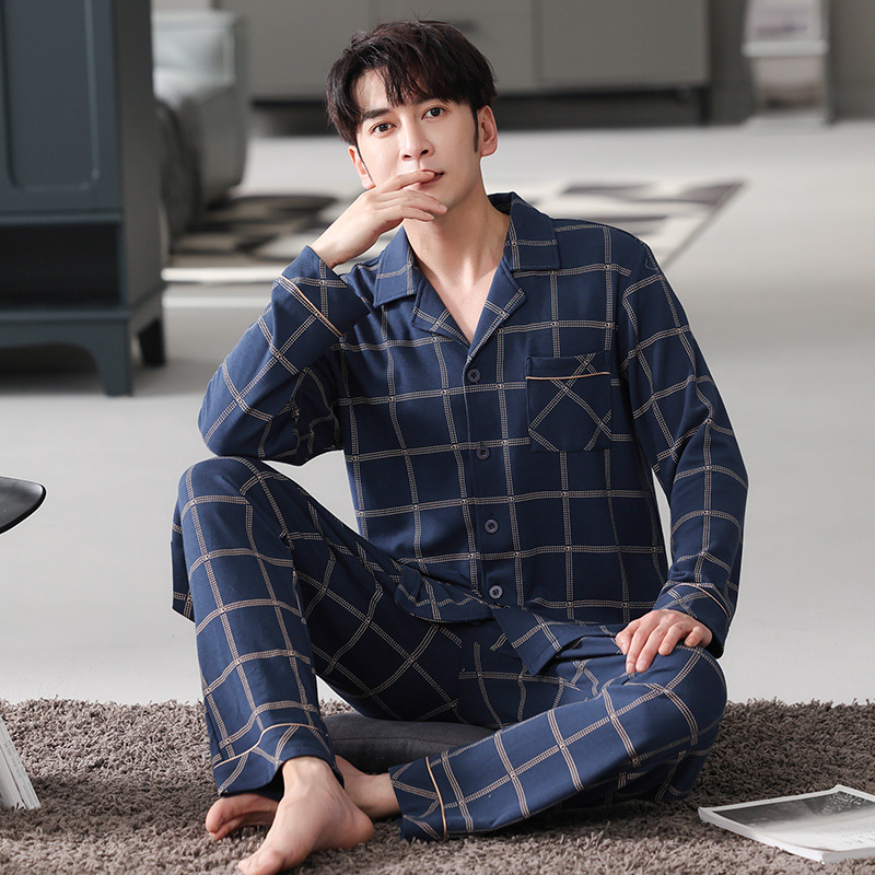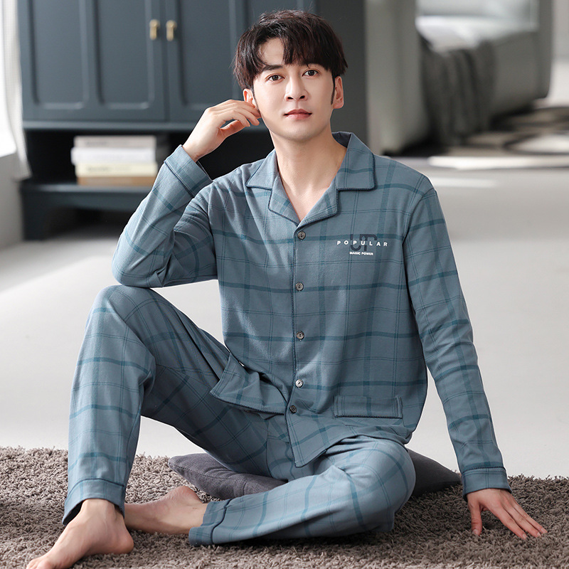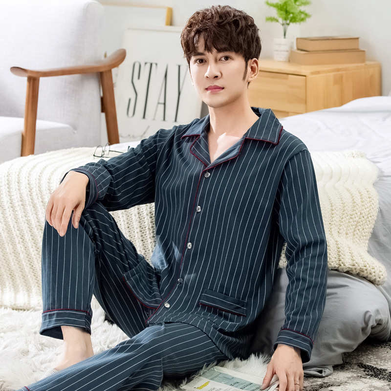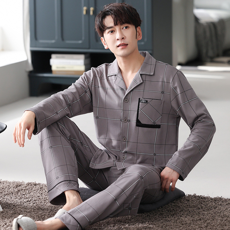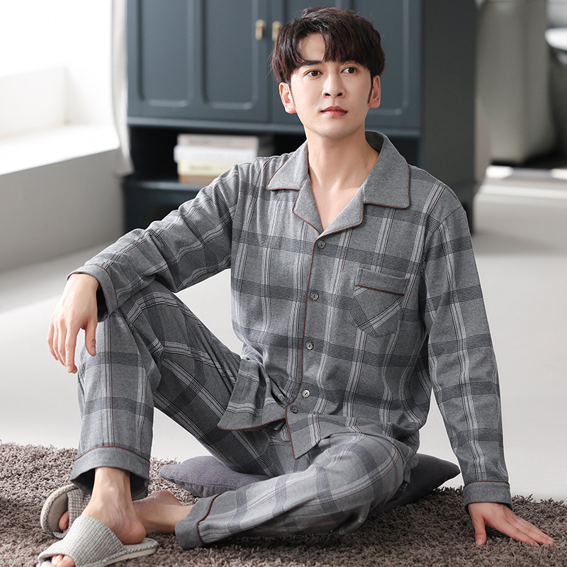 가을과 겨울 남자의 순면 홈 의류 세트 편안한 스트라이프 격자 무늬 카디건 긴 소매 투피스 청소년 잠옷스토어 가기
