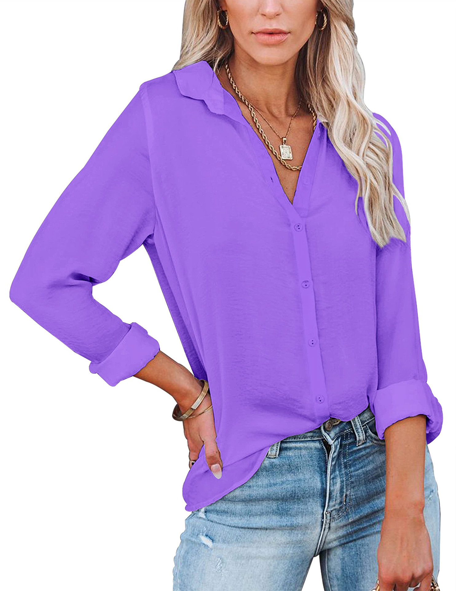 여성 버튼 다운 V 넥 셔츠 긴 소매/짧은 소매 사무실 캐주얼 비즈니스 단색 블라우스 탑스토어 가기