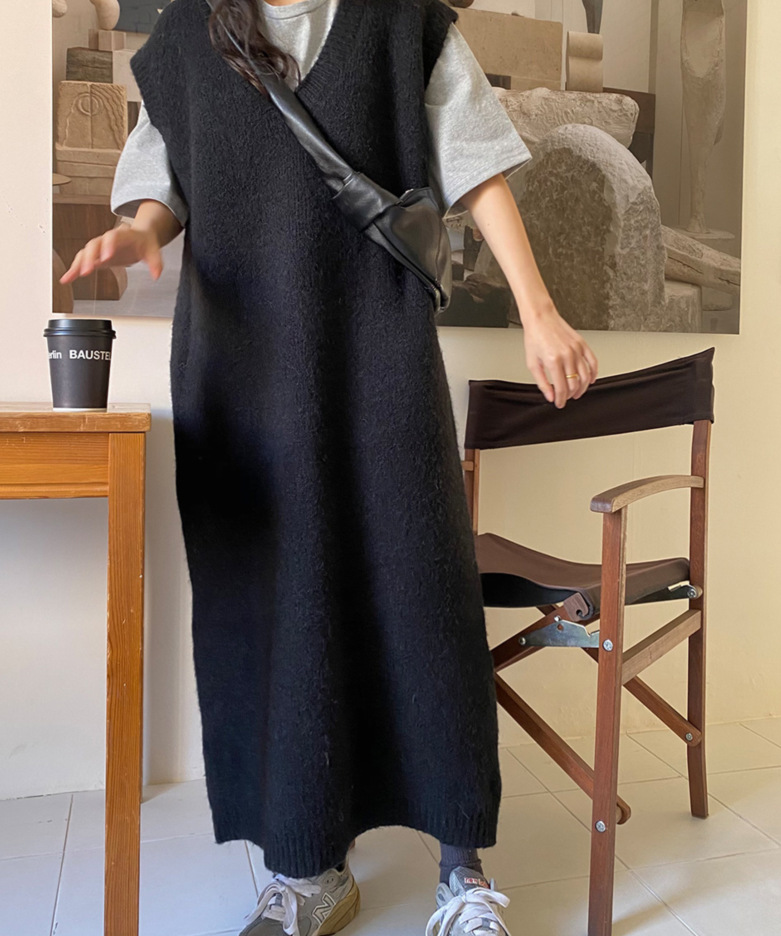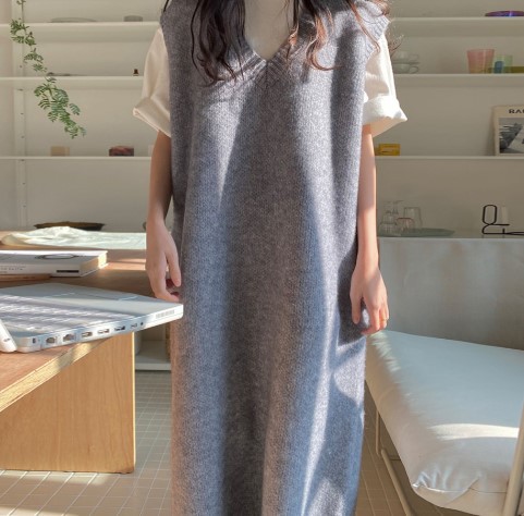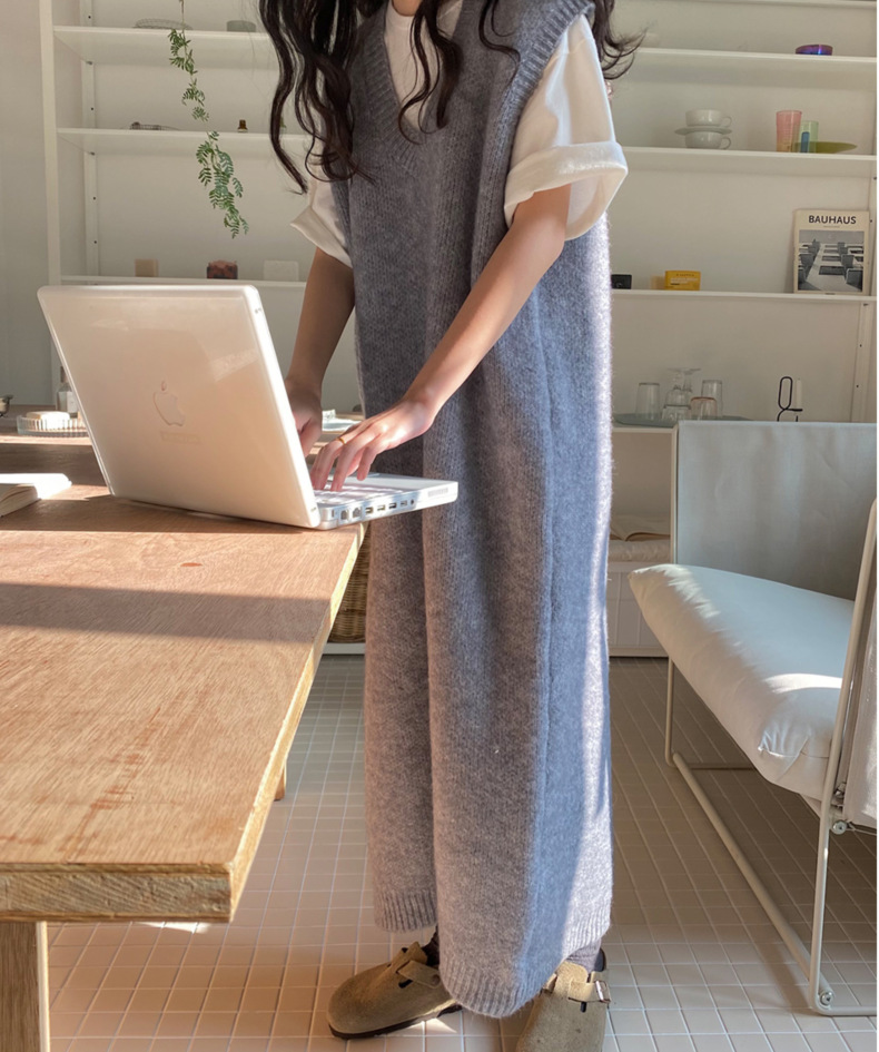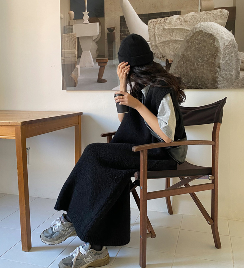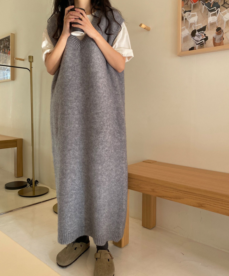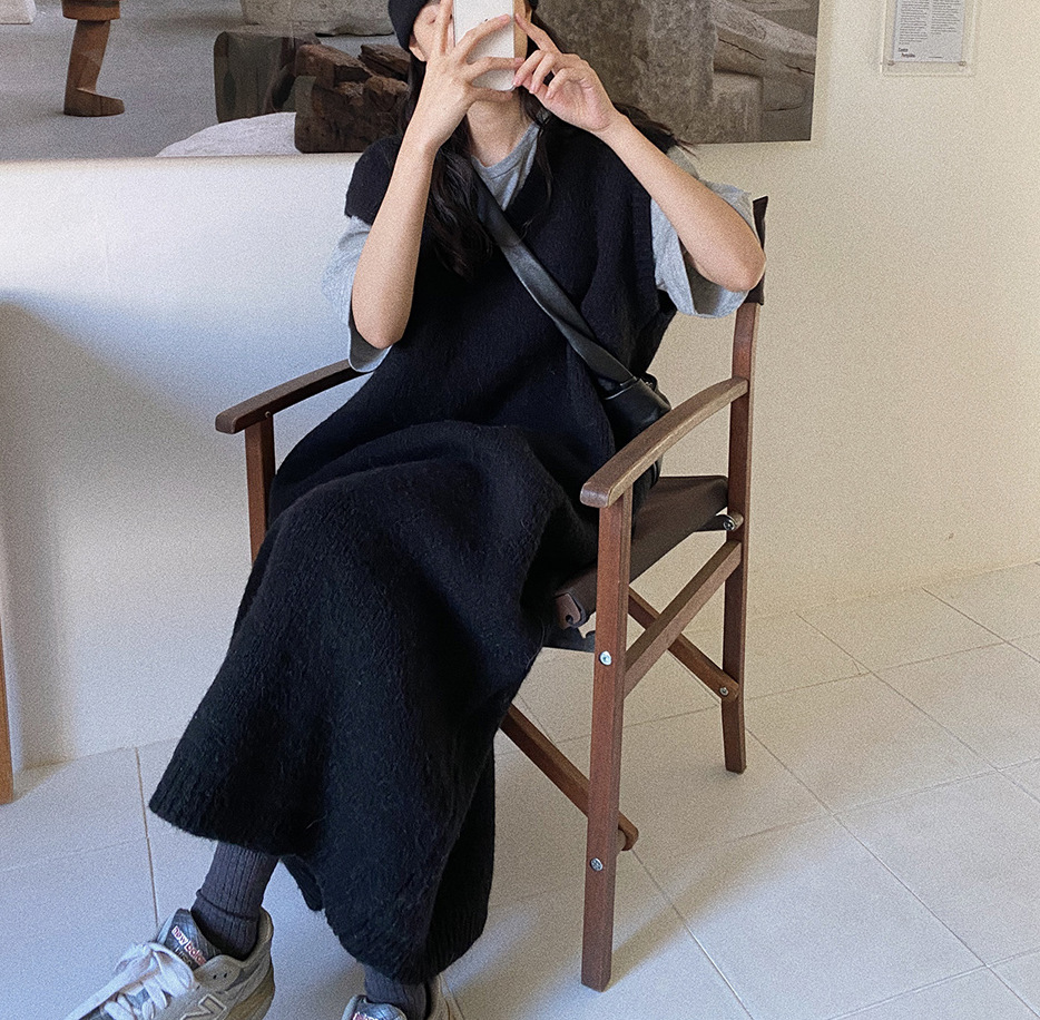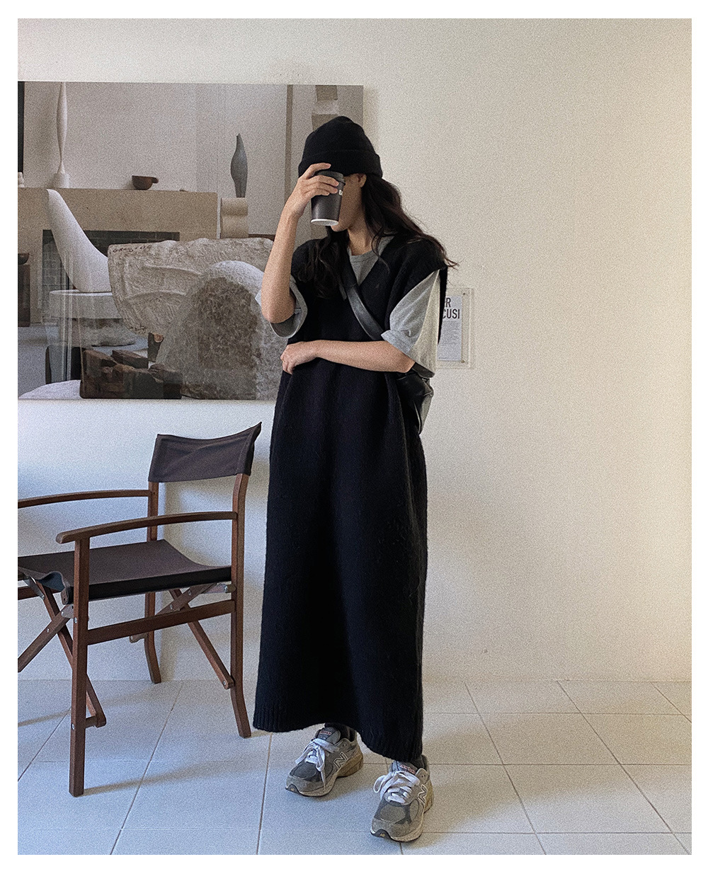 2023 가을과 겨울 여성을 원피스 간단한 단색 울트라 롱 플러스 사이즈 V-넥 니트 조끼 스커트 조끼의 새로운 한국어 버전스토어 가기