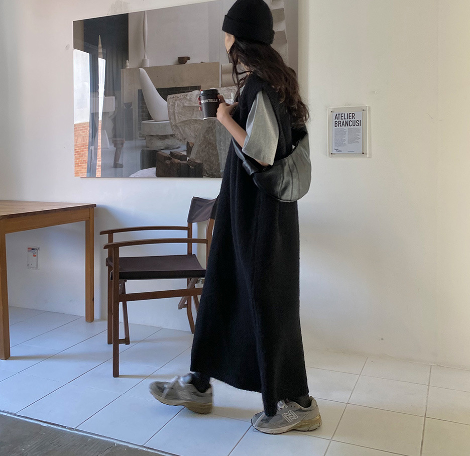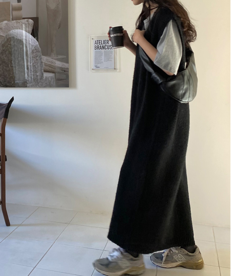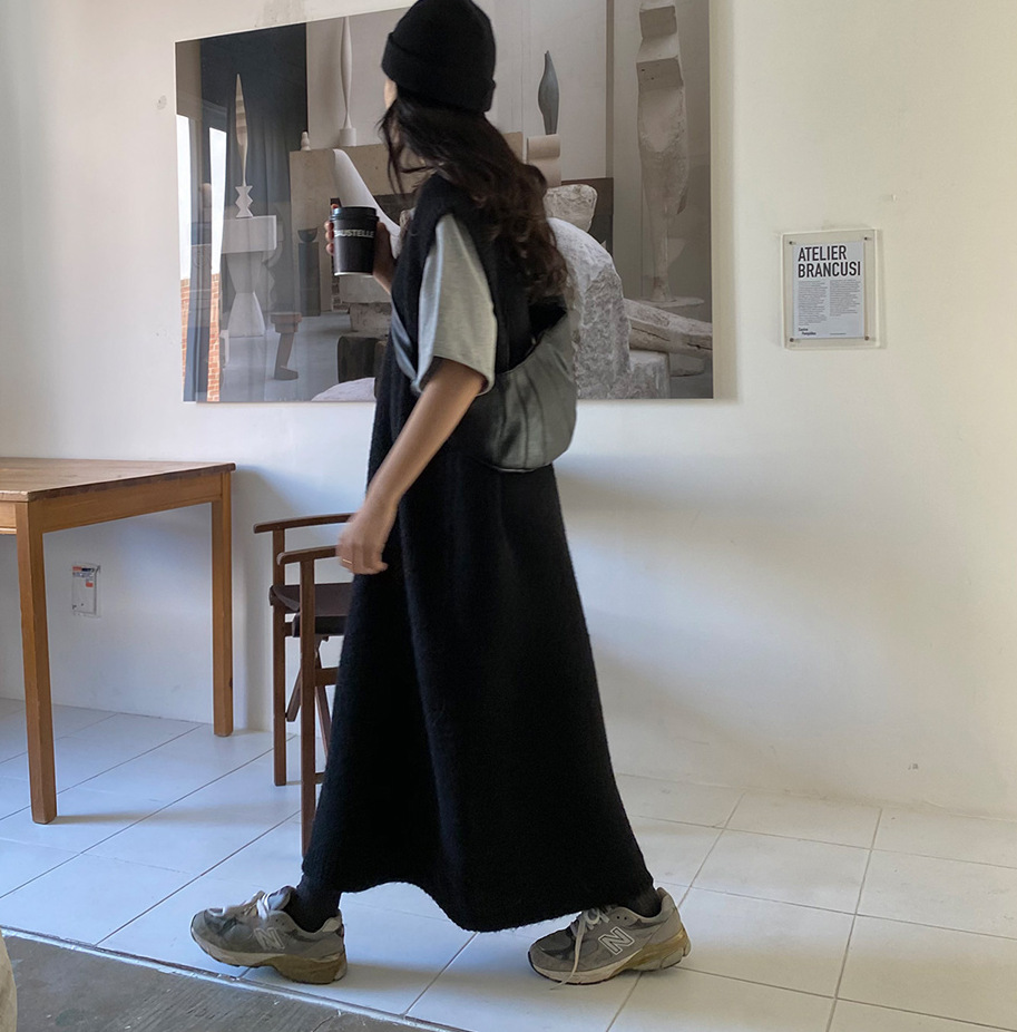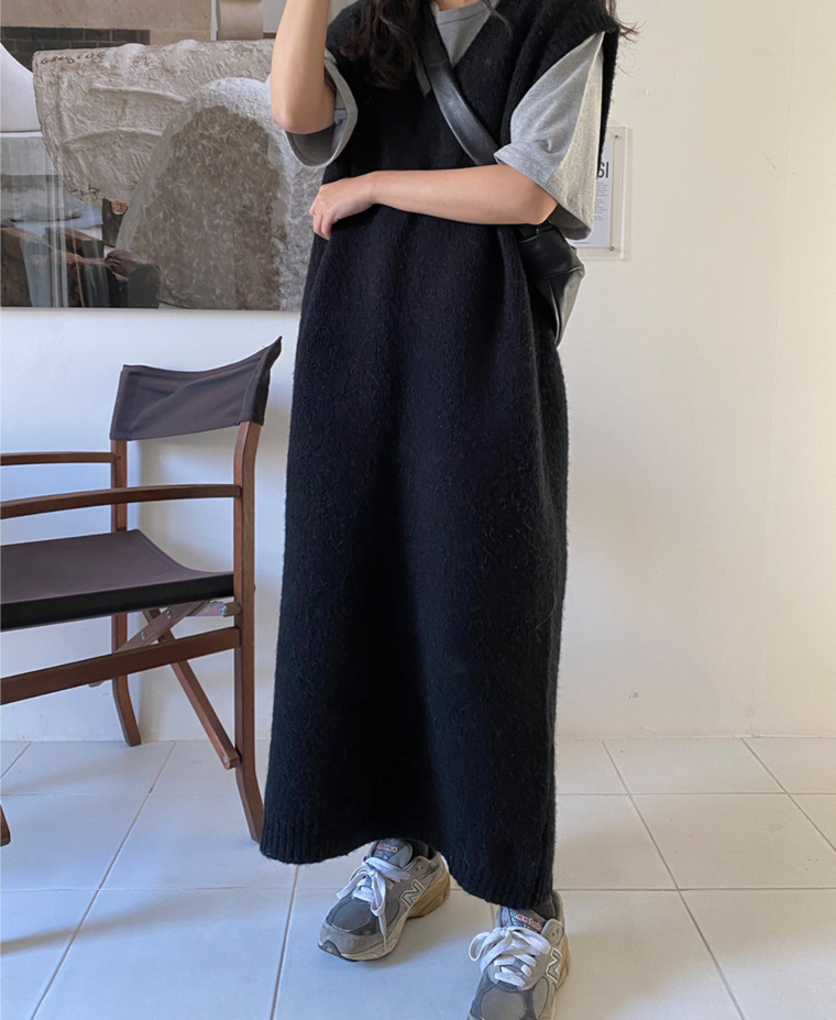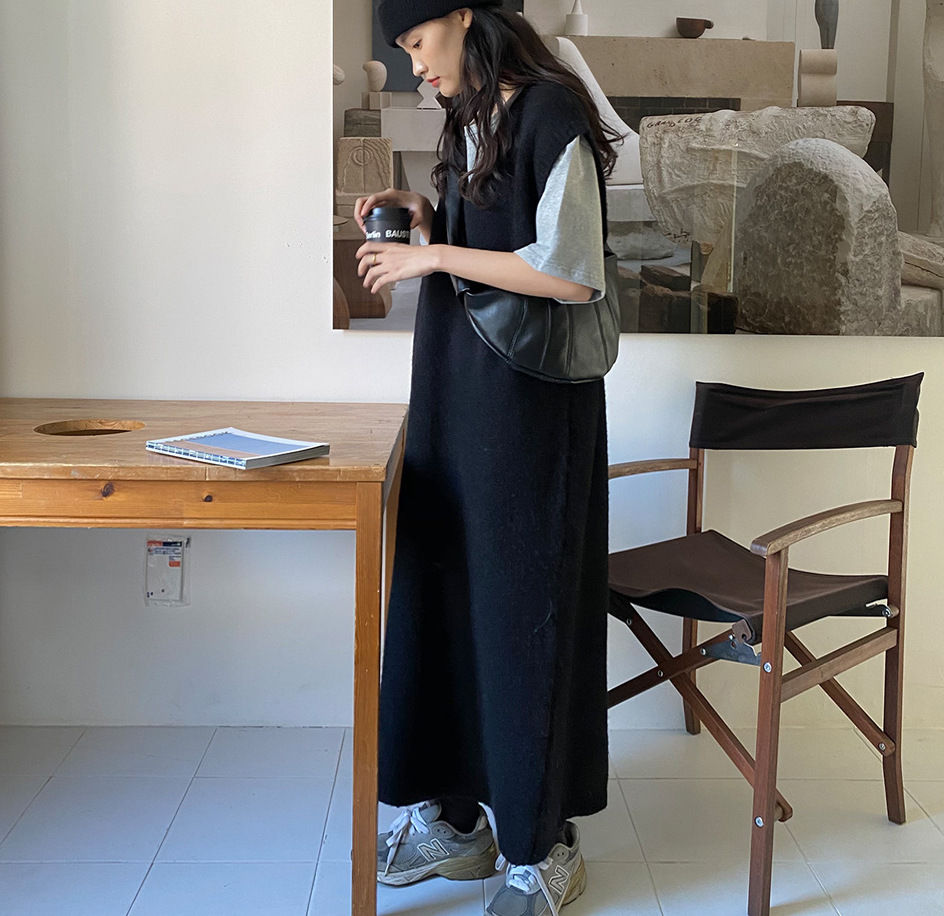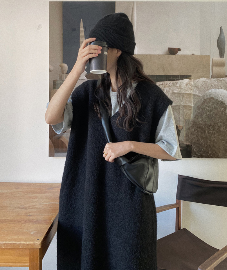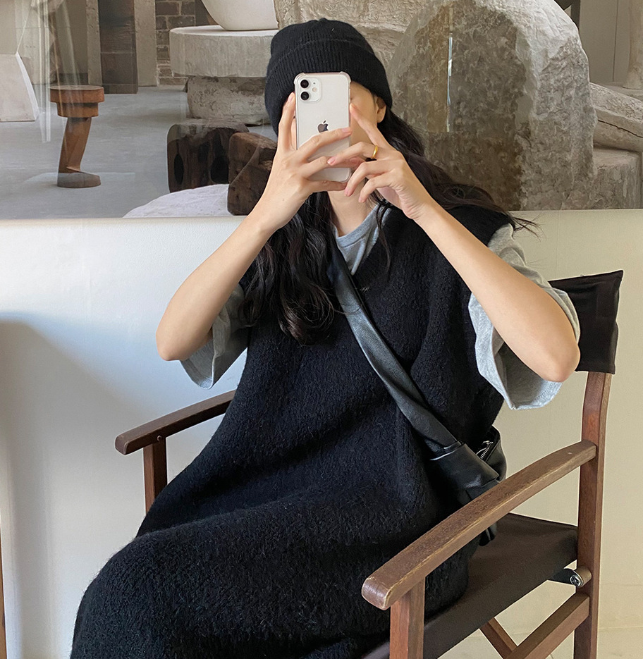 2023 가을과 겨울 여성을 원피스 간단한 단색 울트라 롱 플러스 사이즈 V-넥 니트 조끼 스커트 조끼의 새로운 한국어 버전스토어 가기