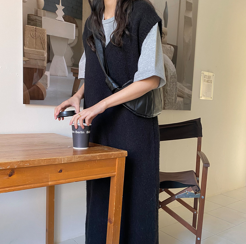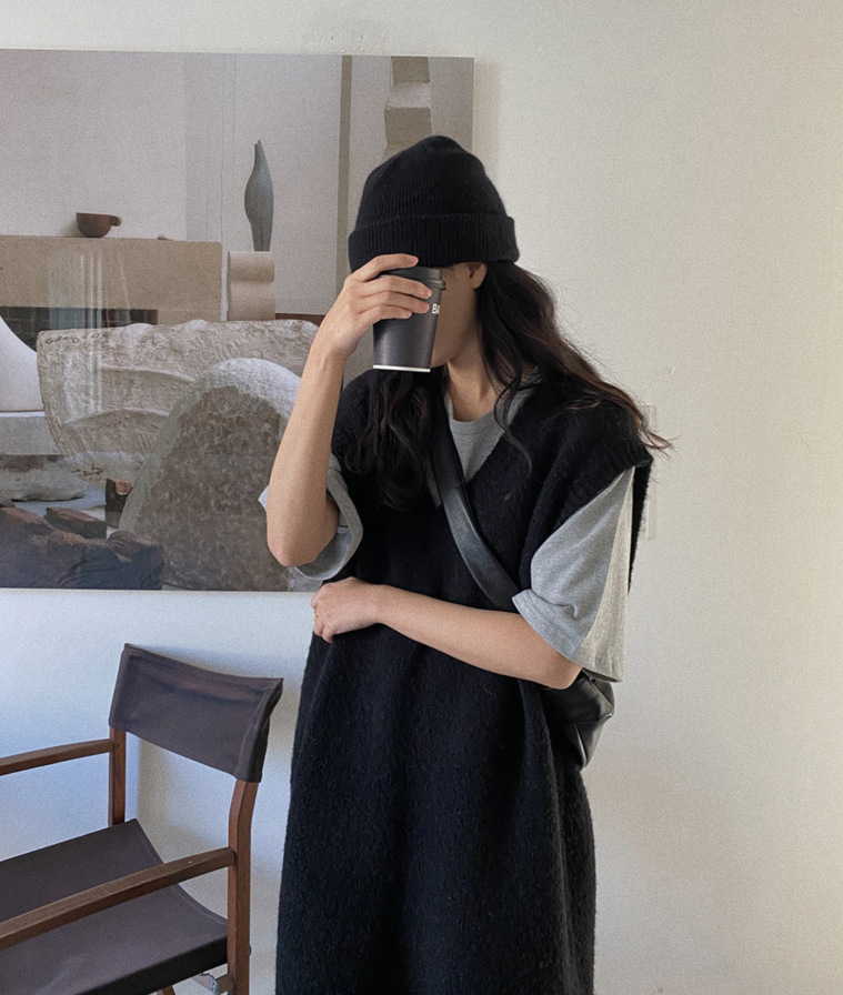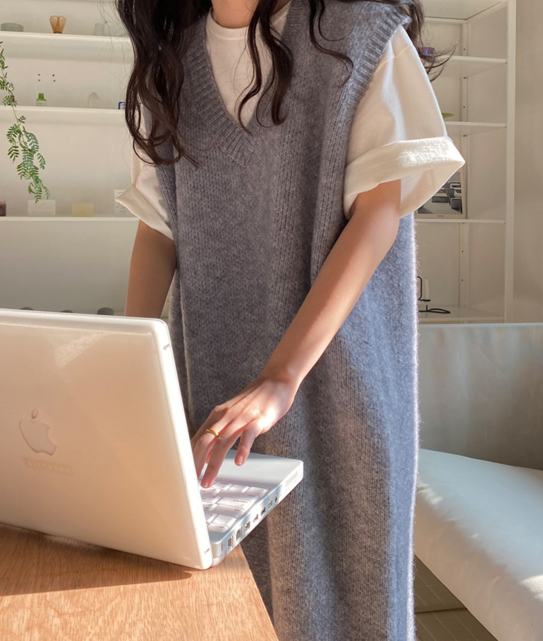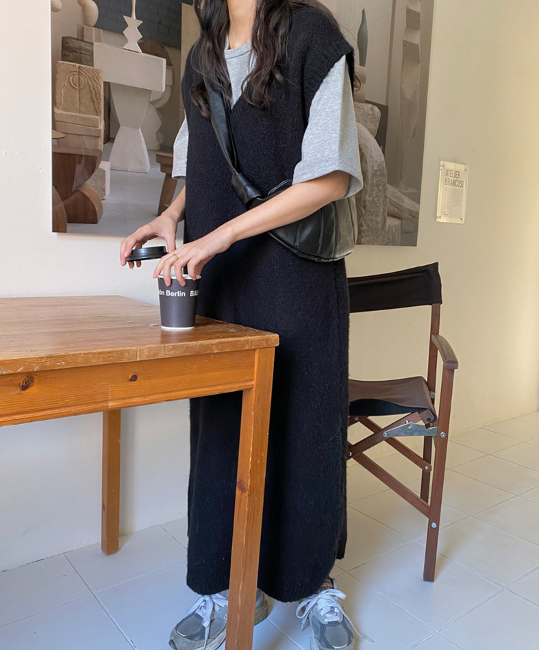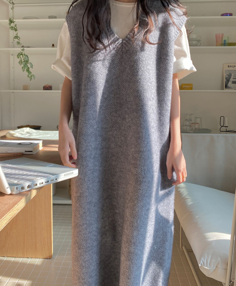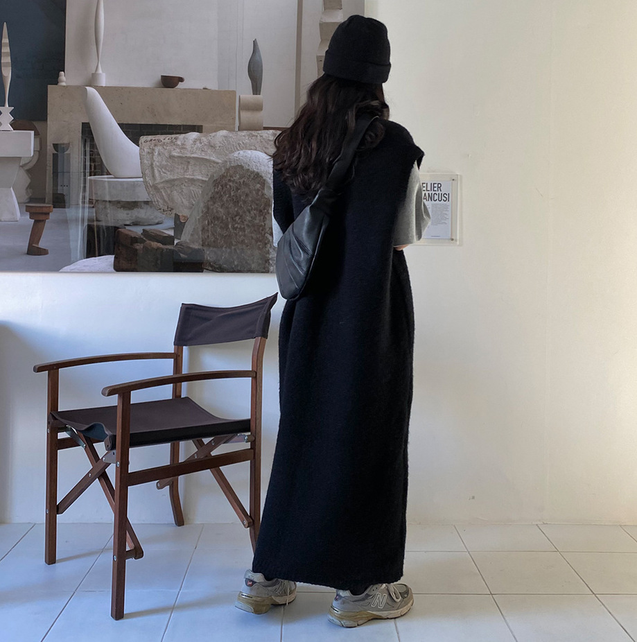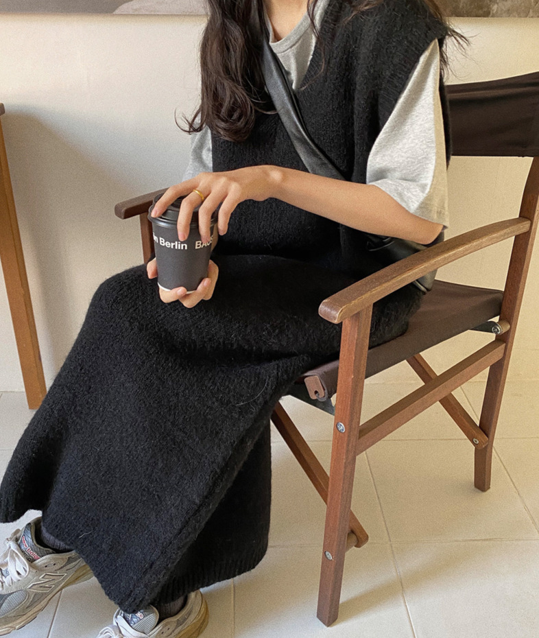 2023 가을과 겨울 여성을 원피스 간단한 단색 울트라 롱 플러스 사이즈 V-넥 니트 조끼 스커트 조끼의 새로운 한국어 버전스토어 가기