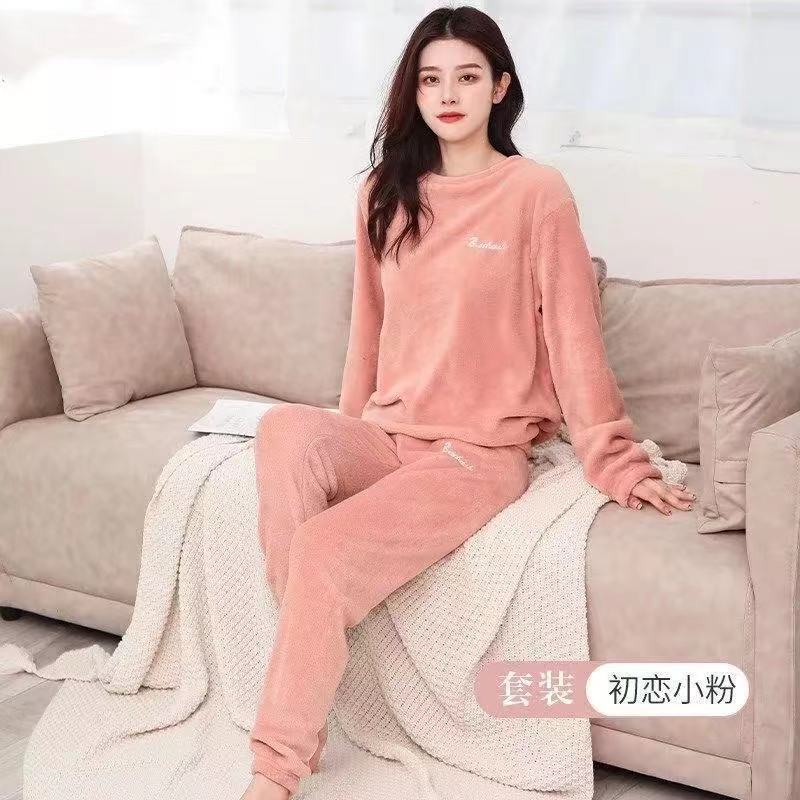 새로운 가을과 겨울 따뜻한 바지 세트 기모 두꺼운 산호 양털 잠옷 겉옷 가정 옷 느슨한 플러스 사이즈 코트 여성스토어 가기