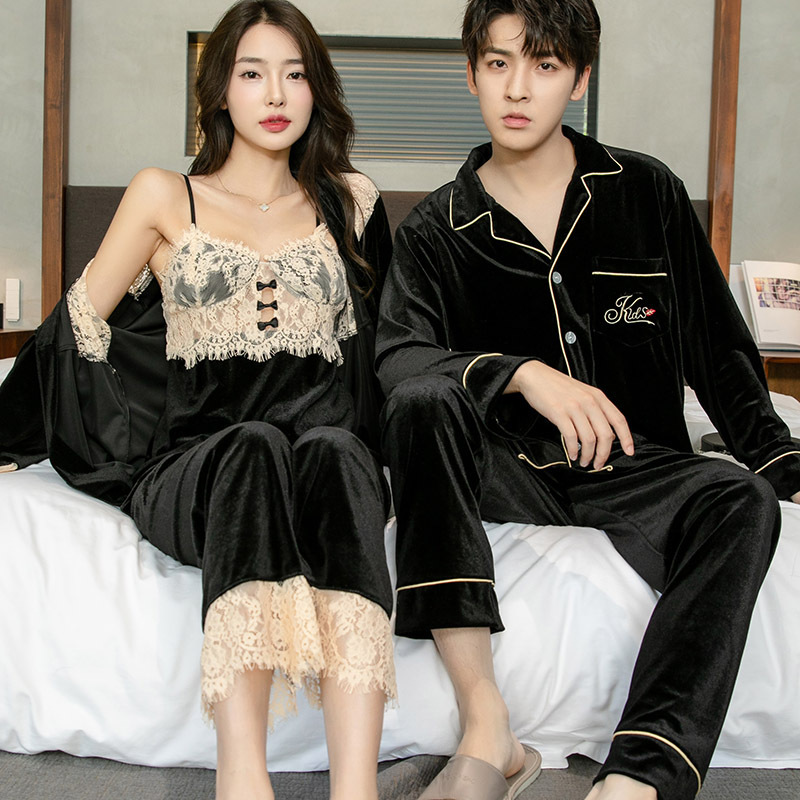 잠옷 여자의 새로운 섹시한 레이스 벨트 가슴 패드 슬링 잠옷 가을과 겨울 황금 벨벳 잠옷 가정 옷 3 종 세트스토어 가기