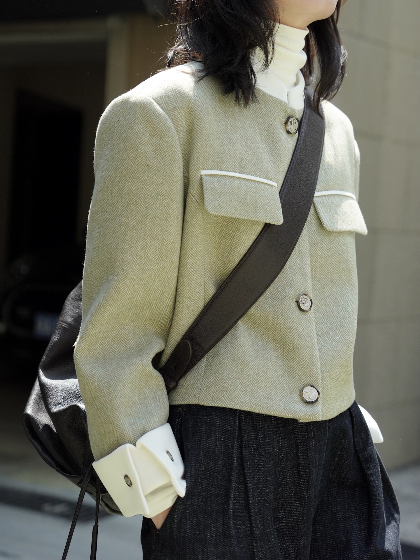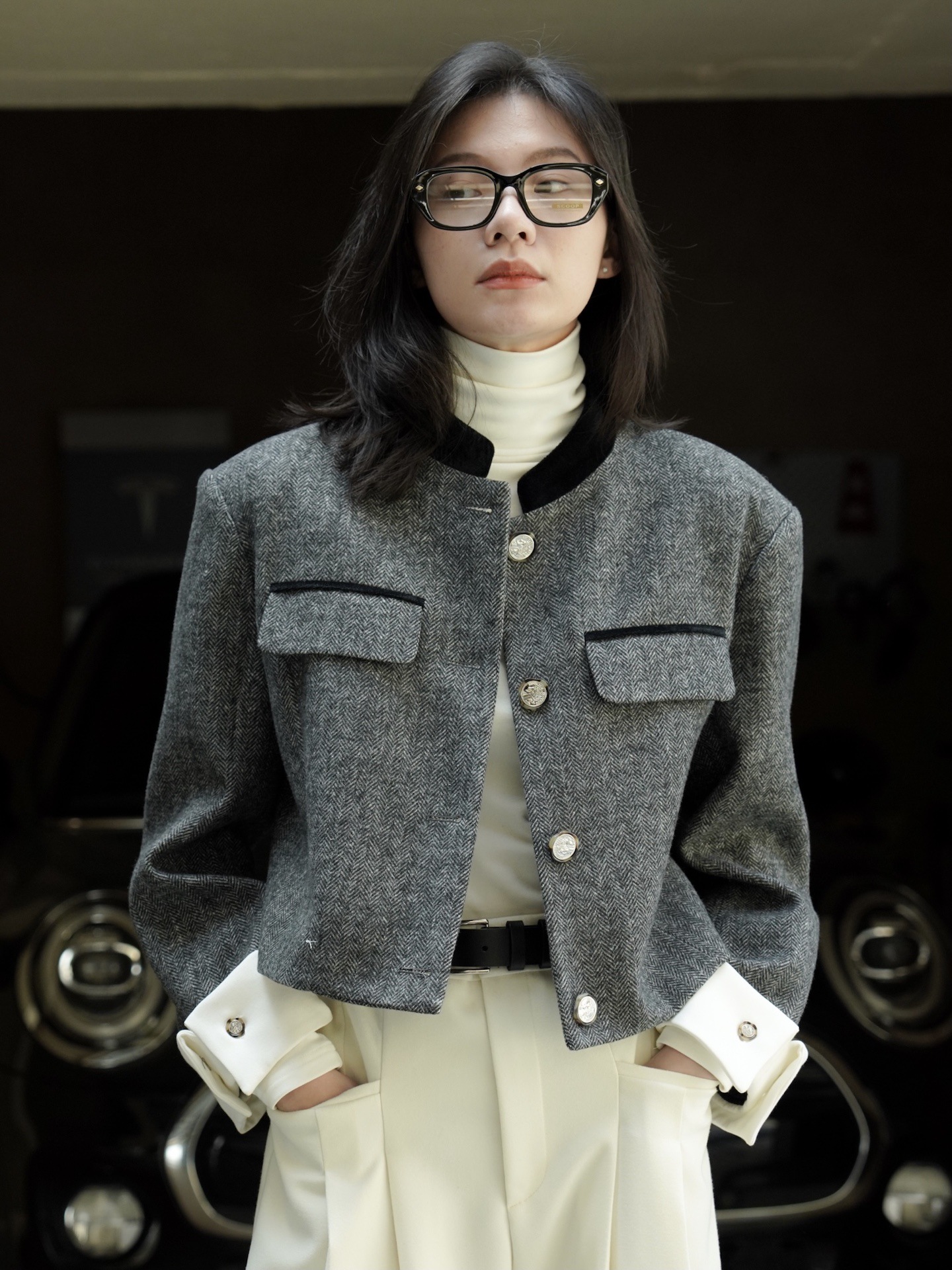 "개인 스타일" 가을과 겨울 새로운 프랑스 스타일 샤넬 스타일 울 세트 커프 대비 컬러 스티치 여성의 두꺼운 통근 재킷