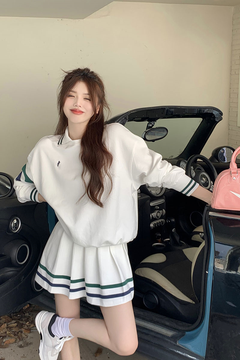 스트라이프 스포츠 폴로 칼라 스웨터 여성의 이른 가을 미국 스타일 복고풍 긴 소매 코트 화이트 스파이스 소녀 느슨한 짧은 탑스토어 가기