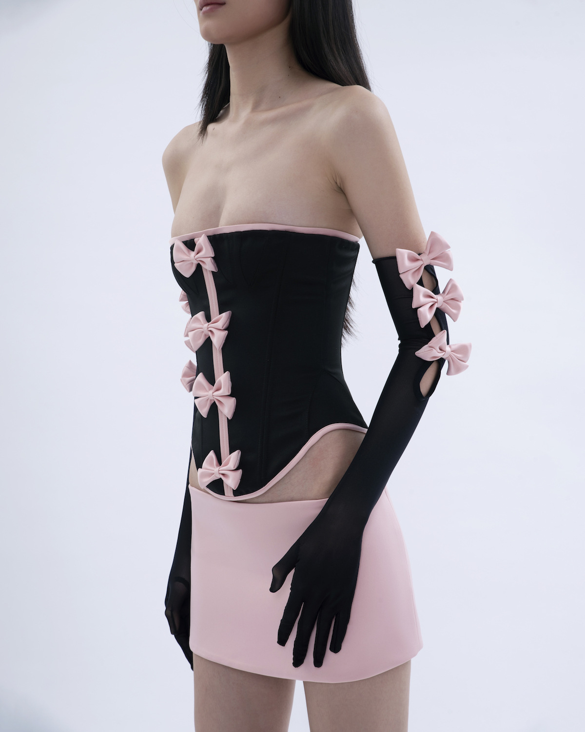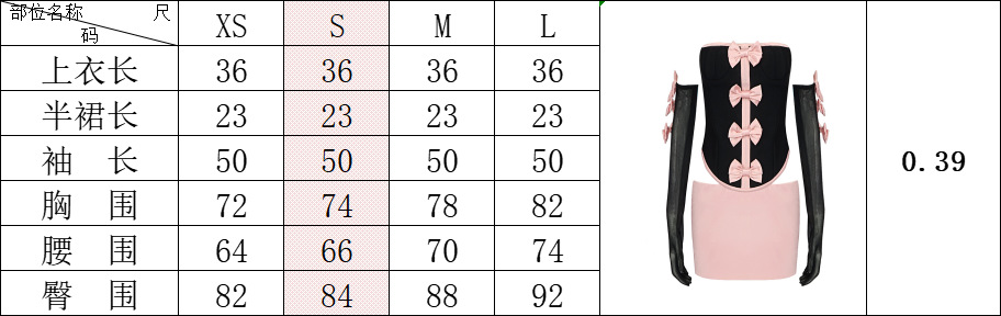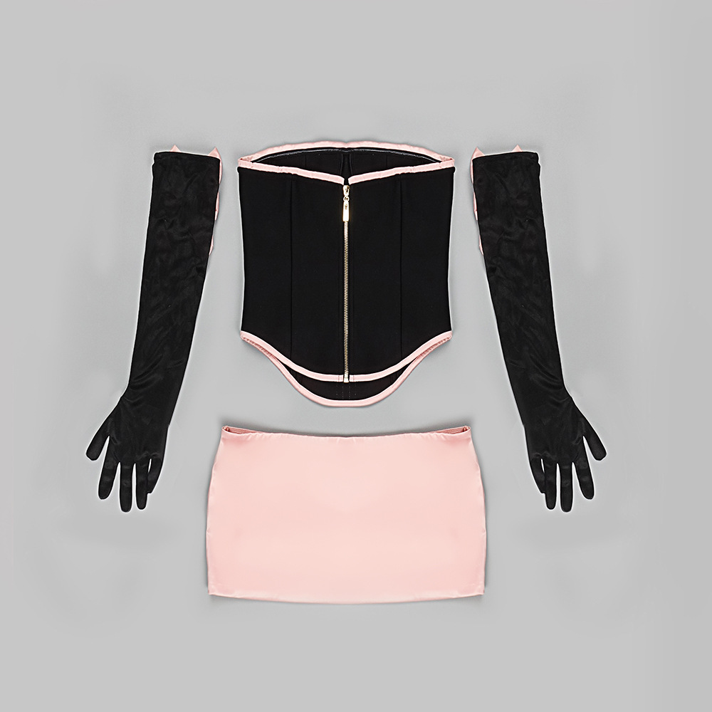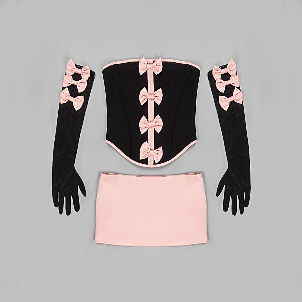 아마존 핑크 배색 리본 튜브탑 미니스커트 장갑 세트 섹시한 여성 유럽풍 4종 세트 우아한 출근룩