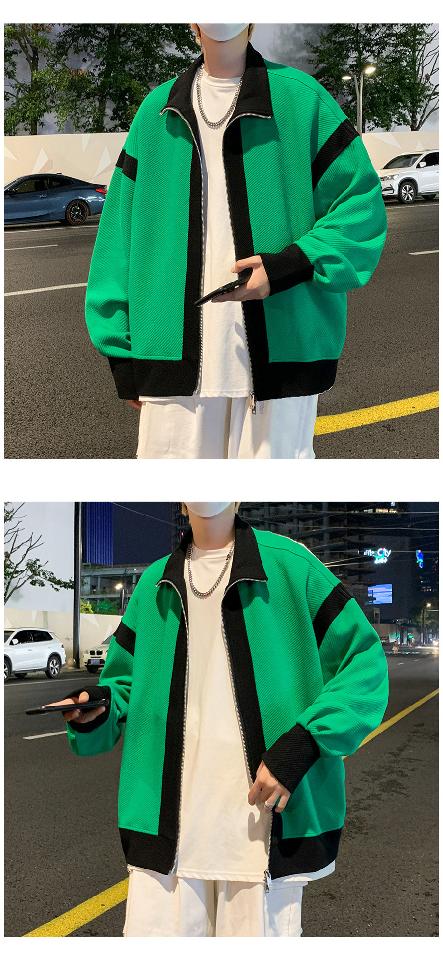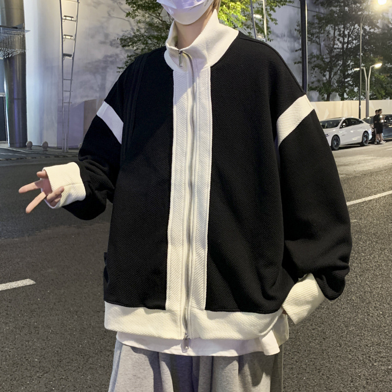 더블 지퍼 재킷 남자의 가을 느슨한 유행 브랜드 홍콩 스타일 스티칭 컬러 매칭 재킷 Ruffian 잘 생긴 캐주얼 니트 탑스토어 가기