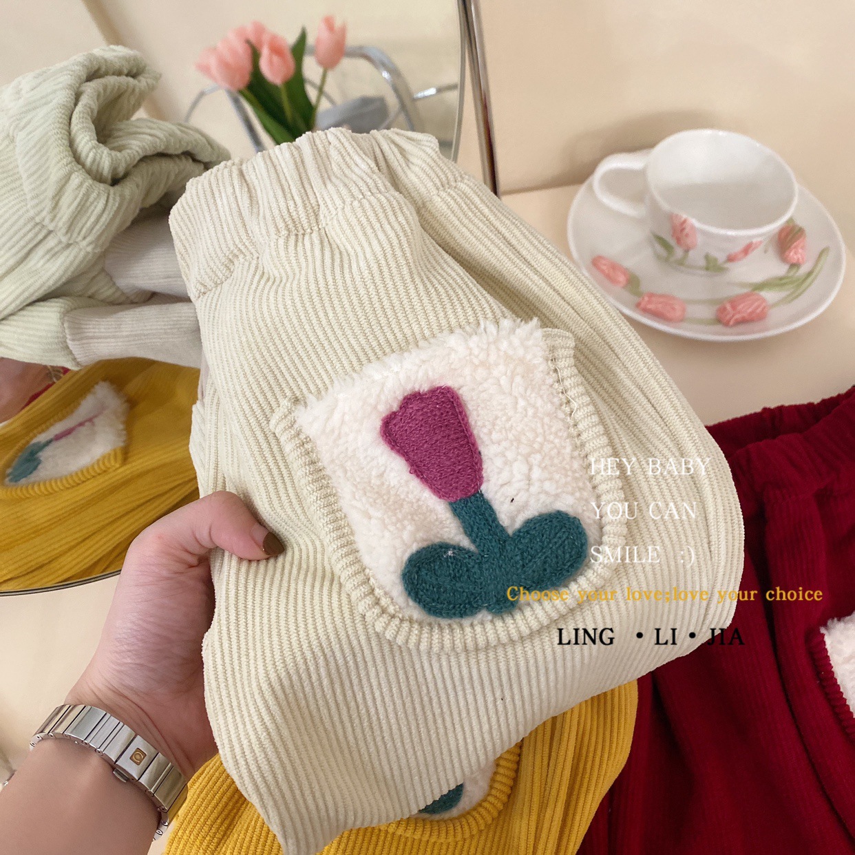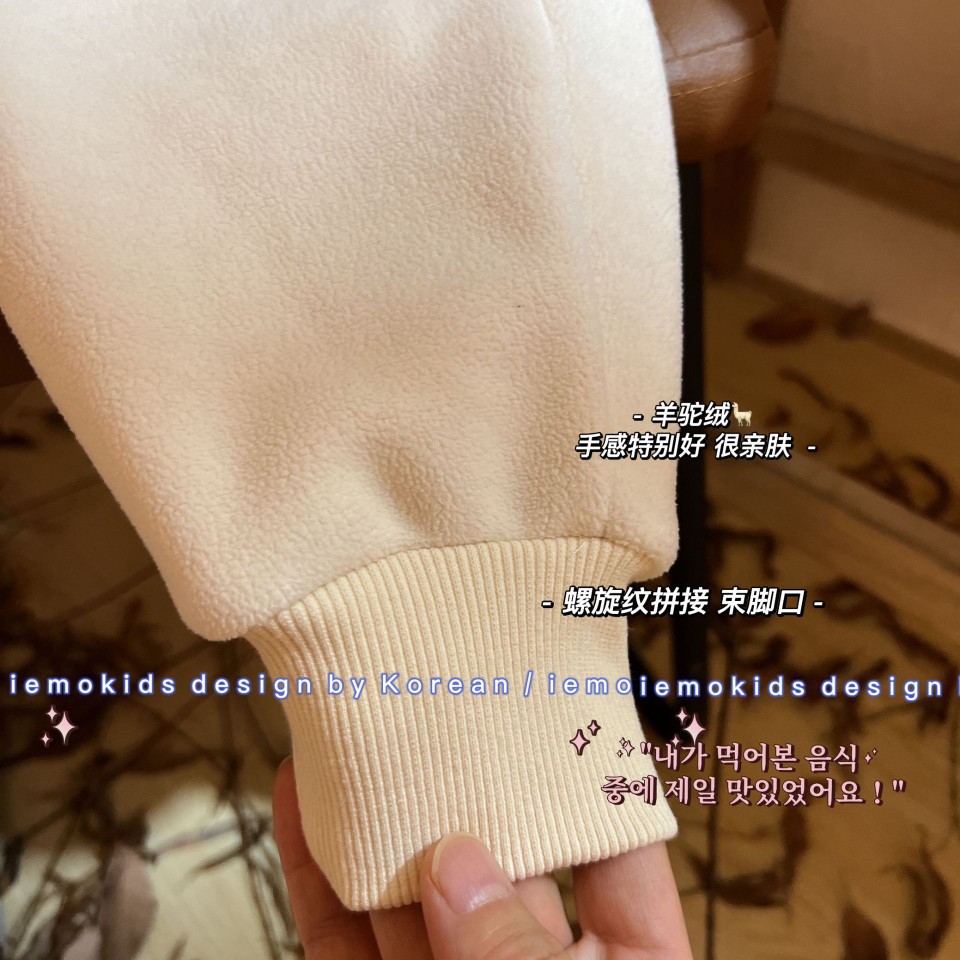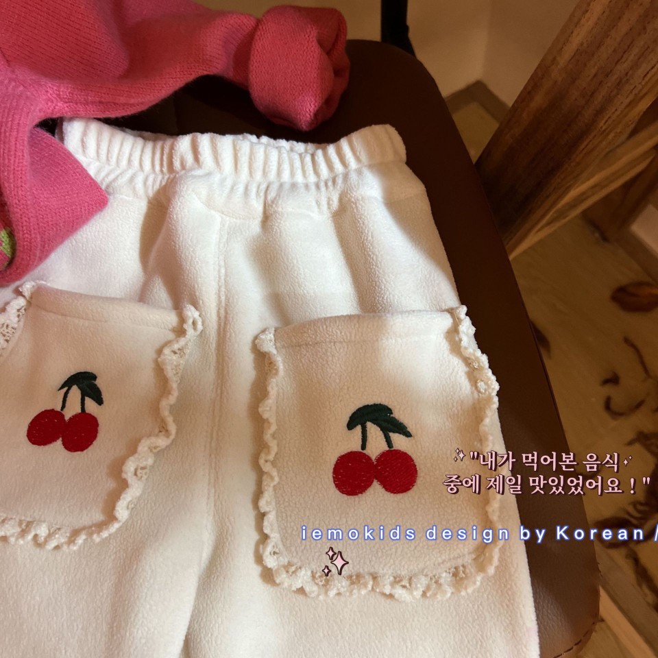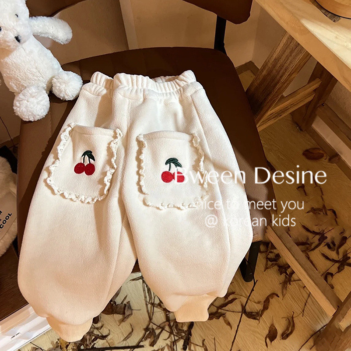 여아 가을 겨울 신상 한국 아동복 체리 자수 베이지색 따뜻한 바지 플리스 안감 조거 팬츠 트렌디한 한국 스타일 아동복