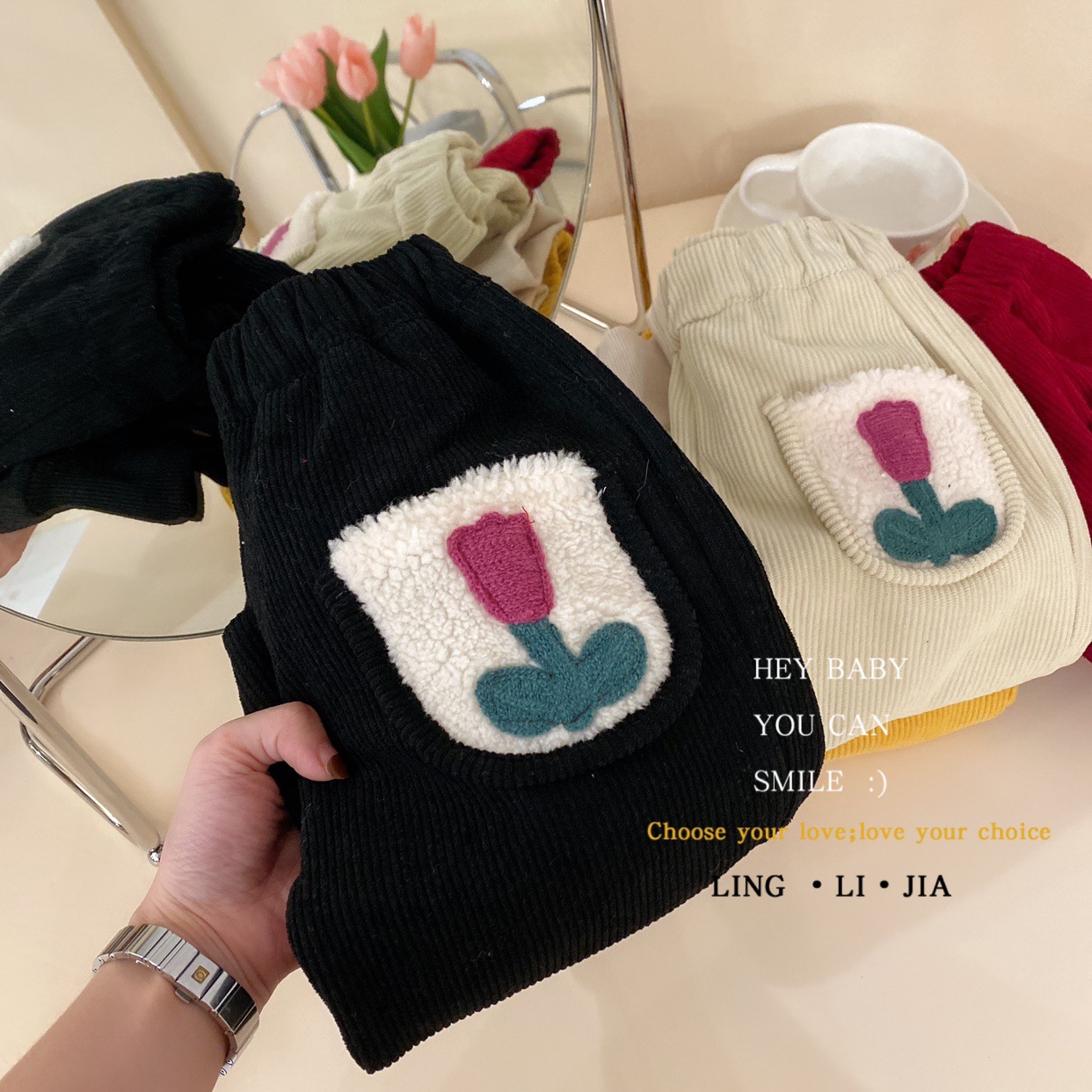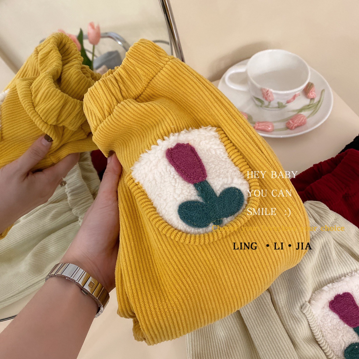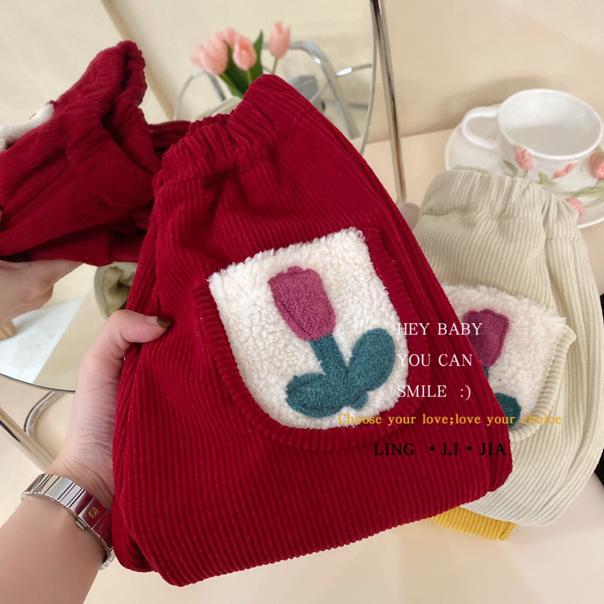 여아 가을 겨울 신상 한국 아동복 체리 자수 베이지색 따뜻한 바지 플리스 안감 조거 팬츠 트렌디한 한국 스타일 아동복