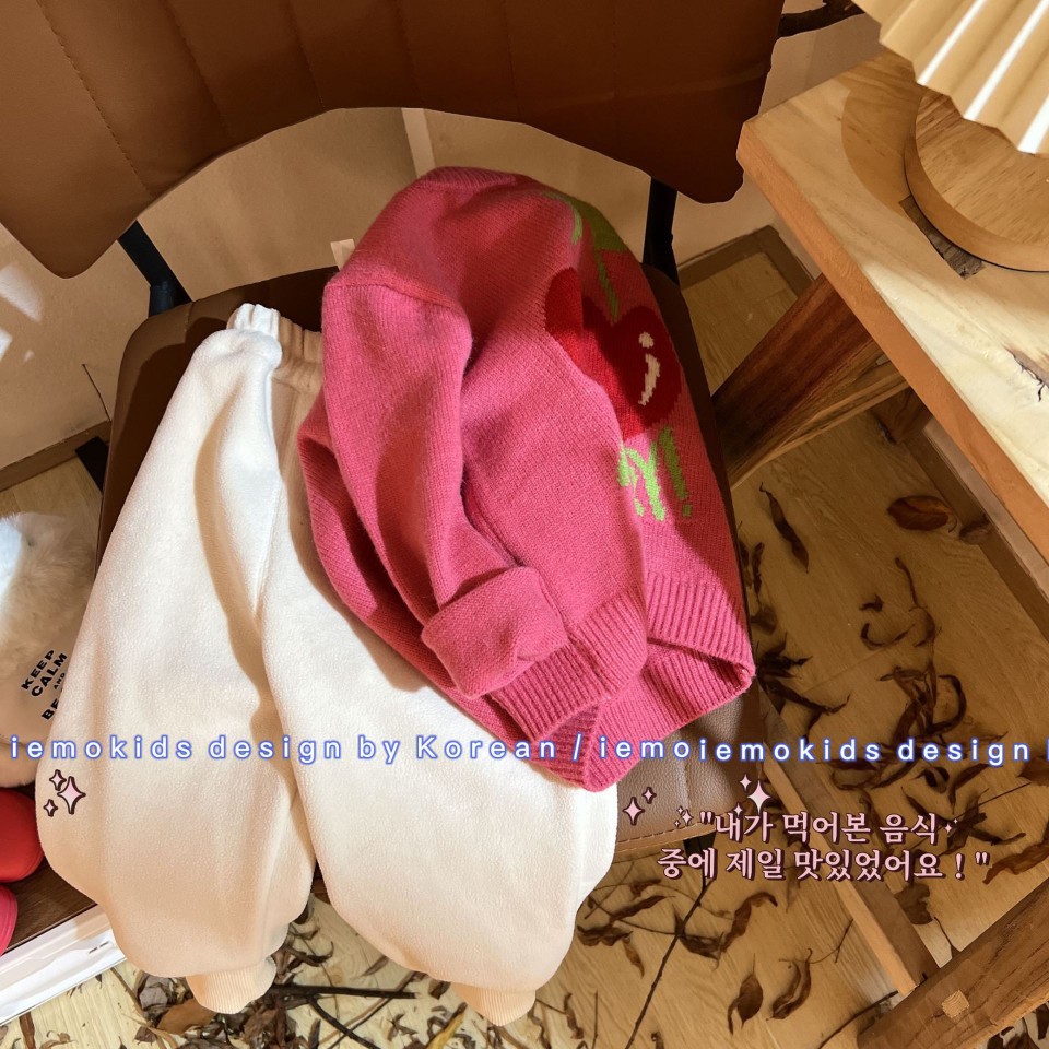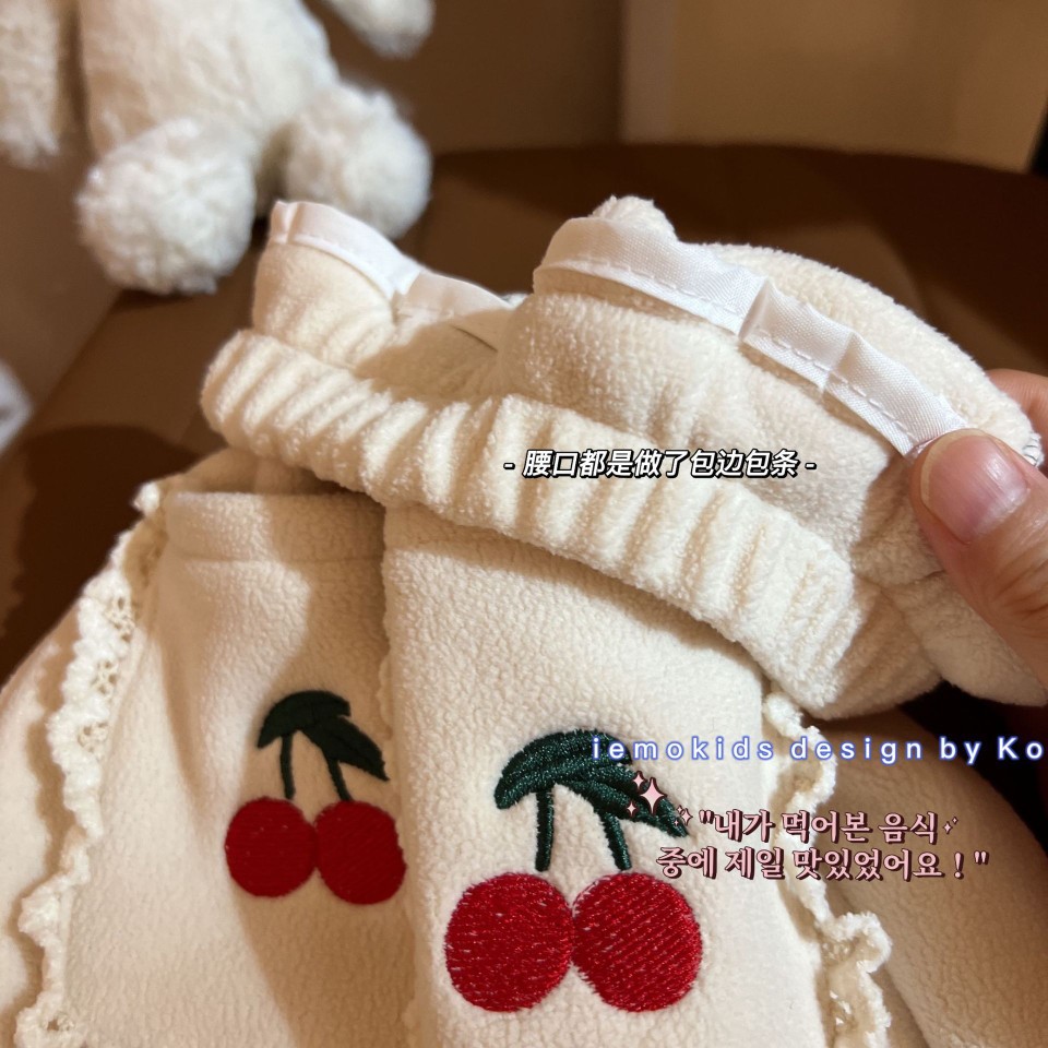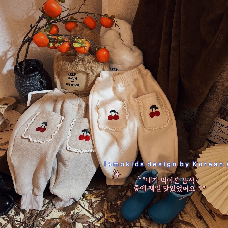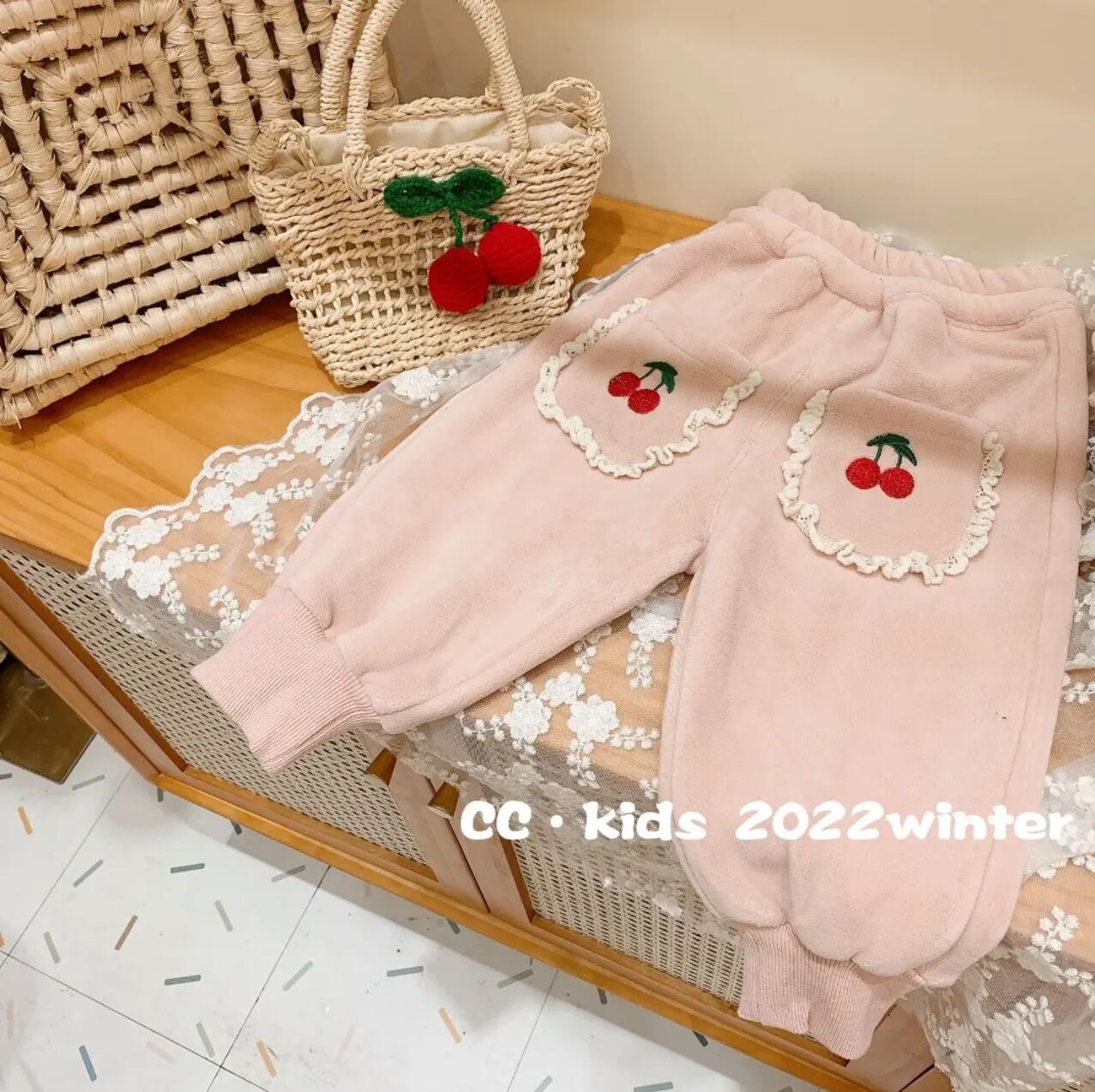 여아 가을 겨울 신상 한국 아동복 체리 자수 베이지색 따뜻한 바지 플리스 안감 조거 팬츠 트렌디한 한국 스타일 아동복스토어 가기