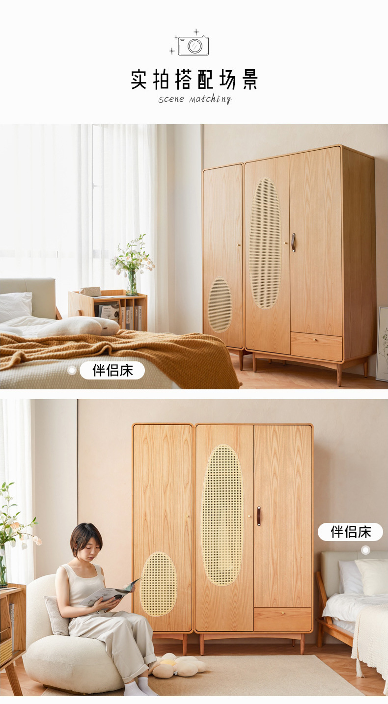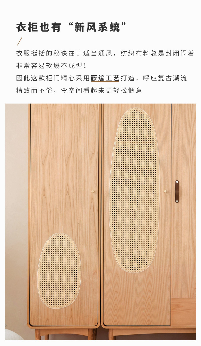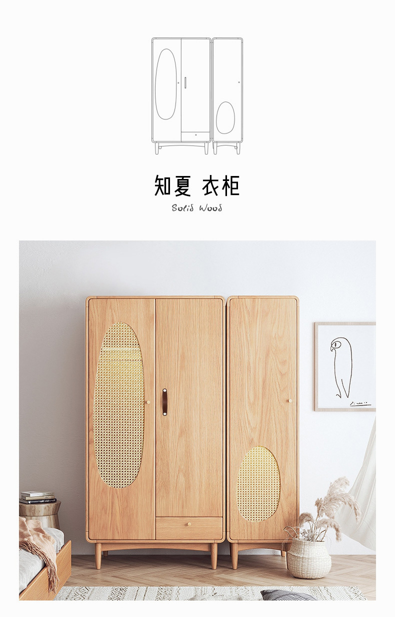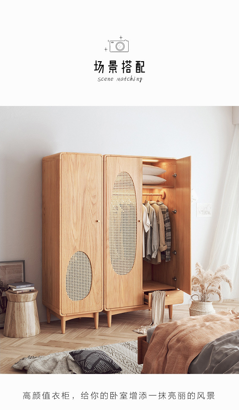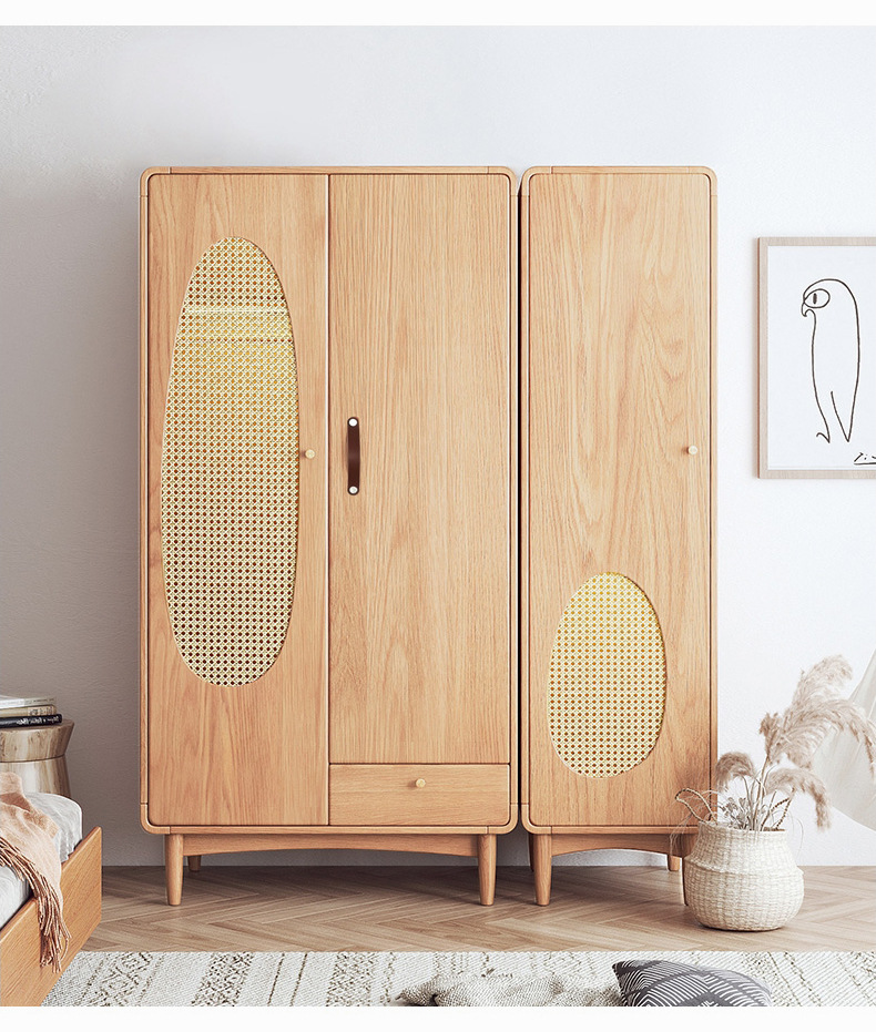 단단한 나무 등나무 옷장 간단한 가정용 애쉬 우드 더블 도어 옷장 북유럽 침실 보관 캐비닛 사물함