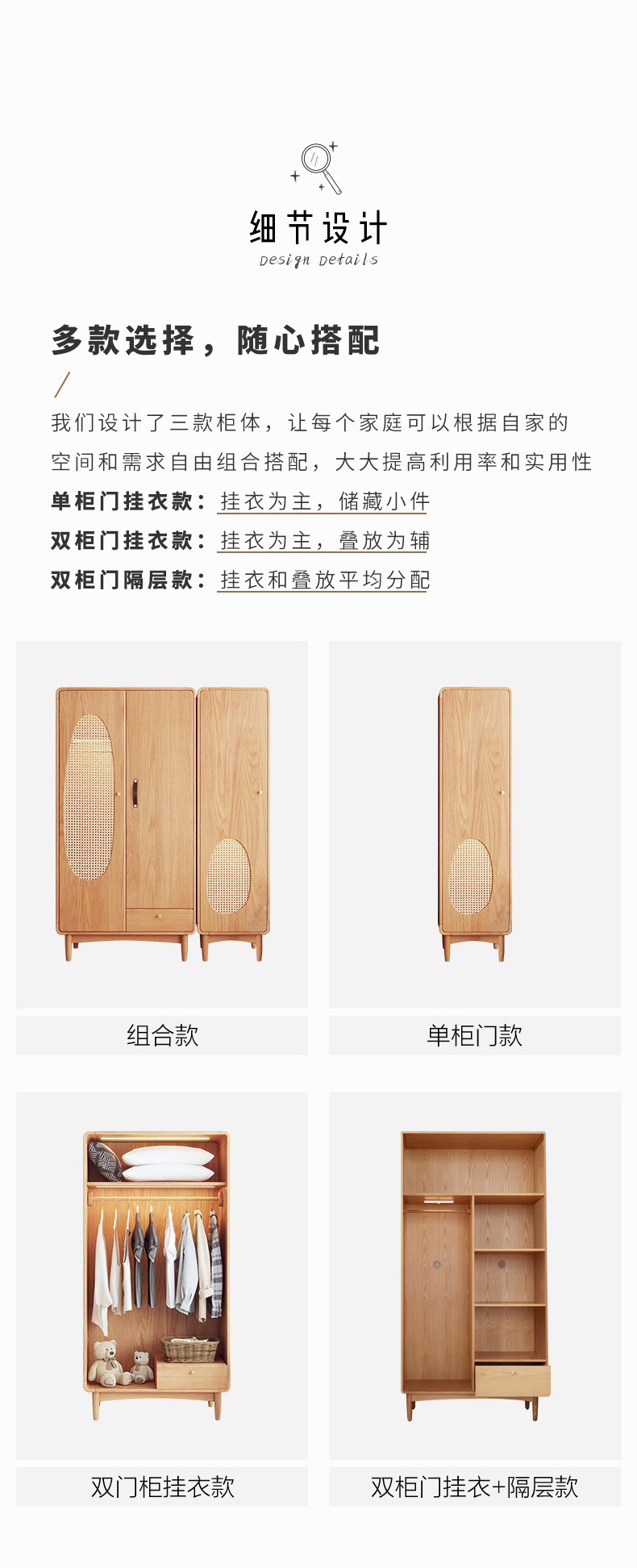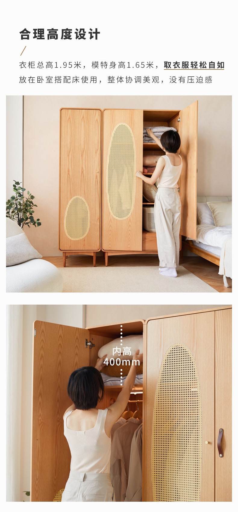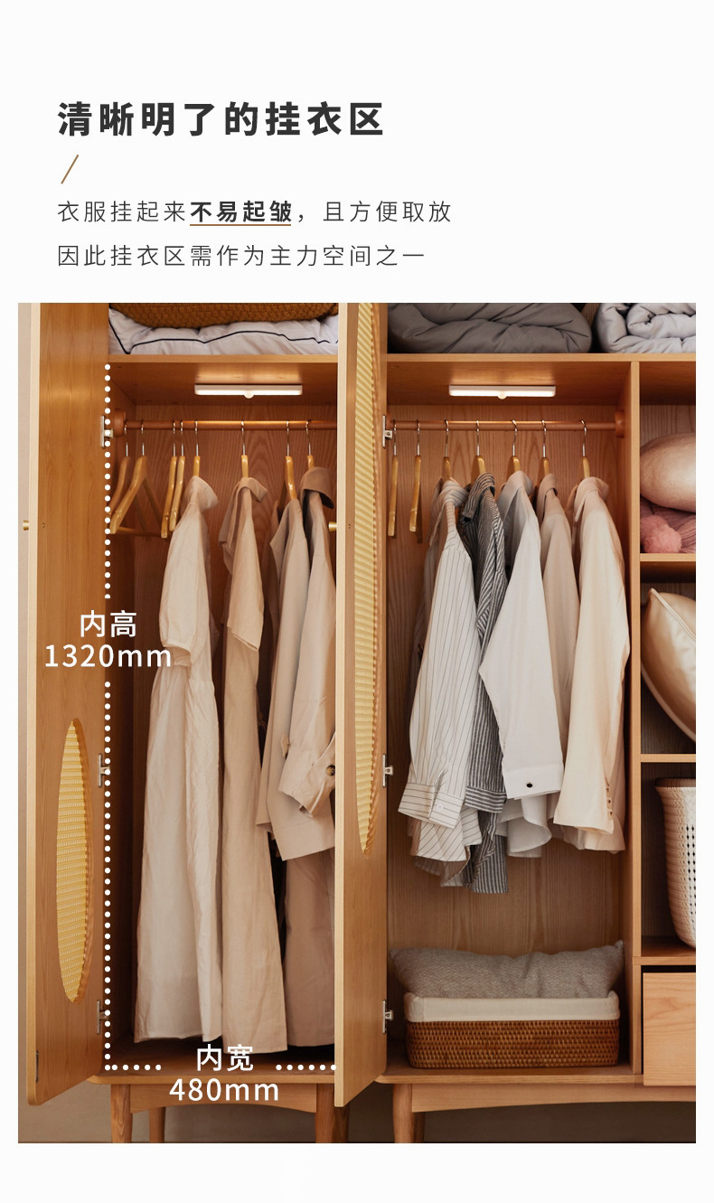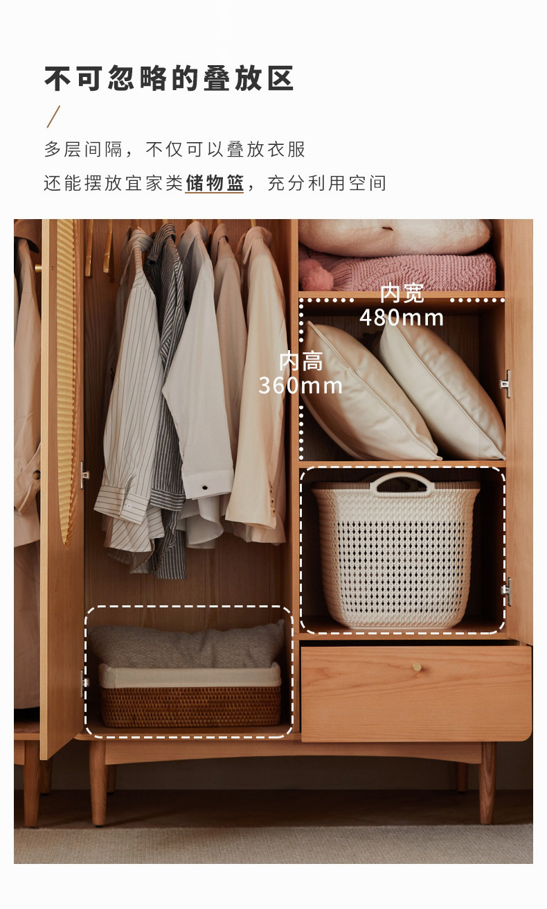단단한 나무 등나무 옷장 간단한 가정용 애쉬 우드 더블 도어 옷장 북유럽 침실 보관 캐비닛 사물함