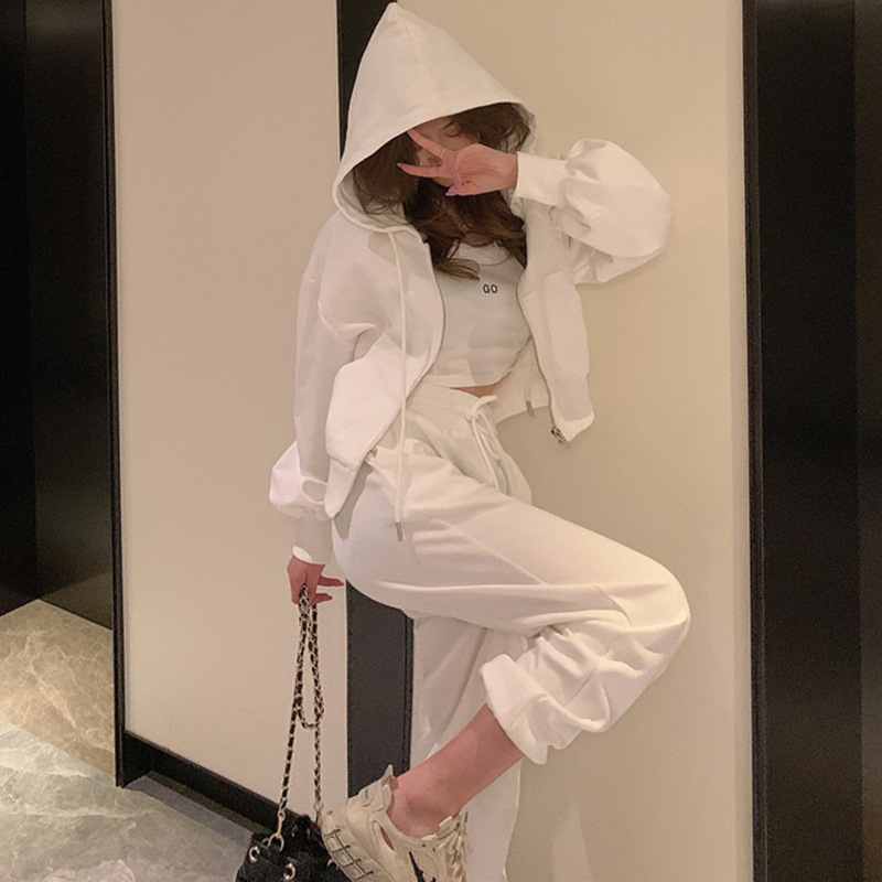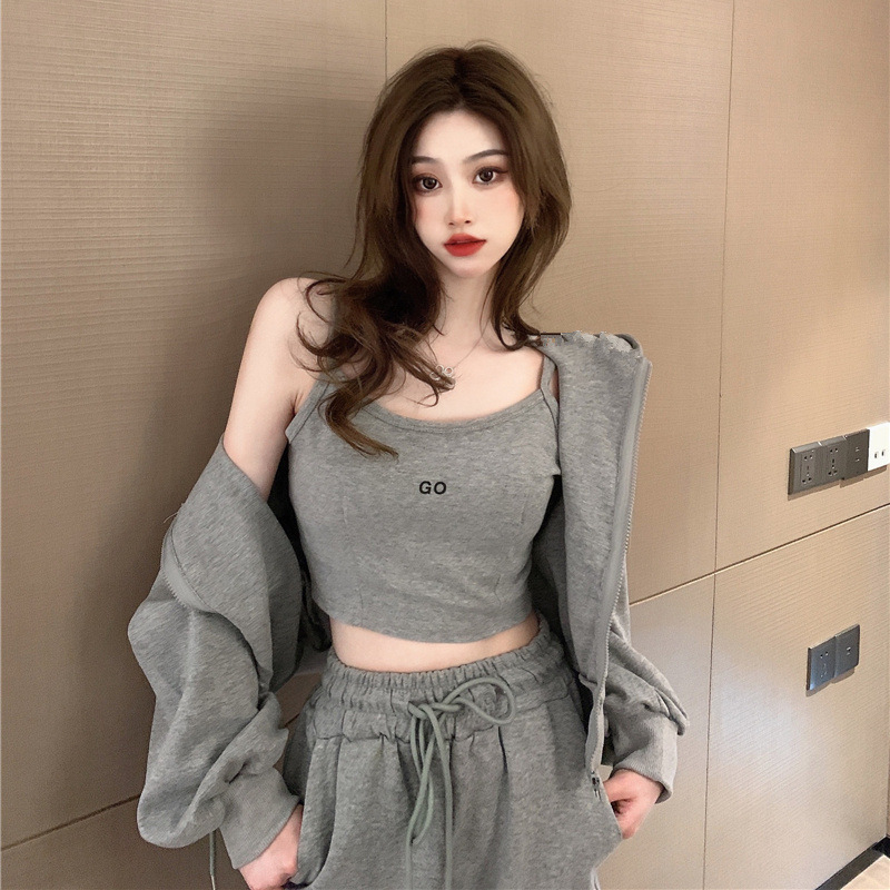 2025 홍콩 스타일 캐주얼 스포츠 정장 여성 패션 짧은 서스펜더 후드 티셔츠 레깅스 3 피스 슈트스토어 가기