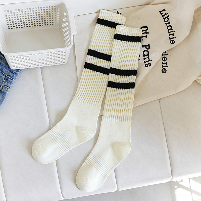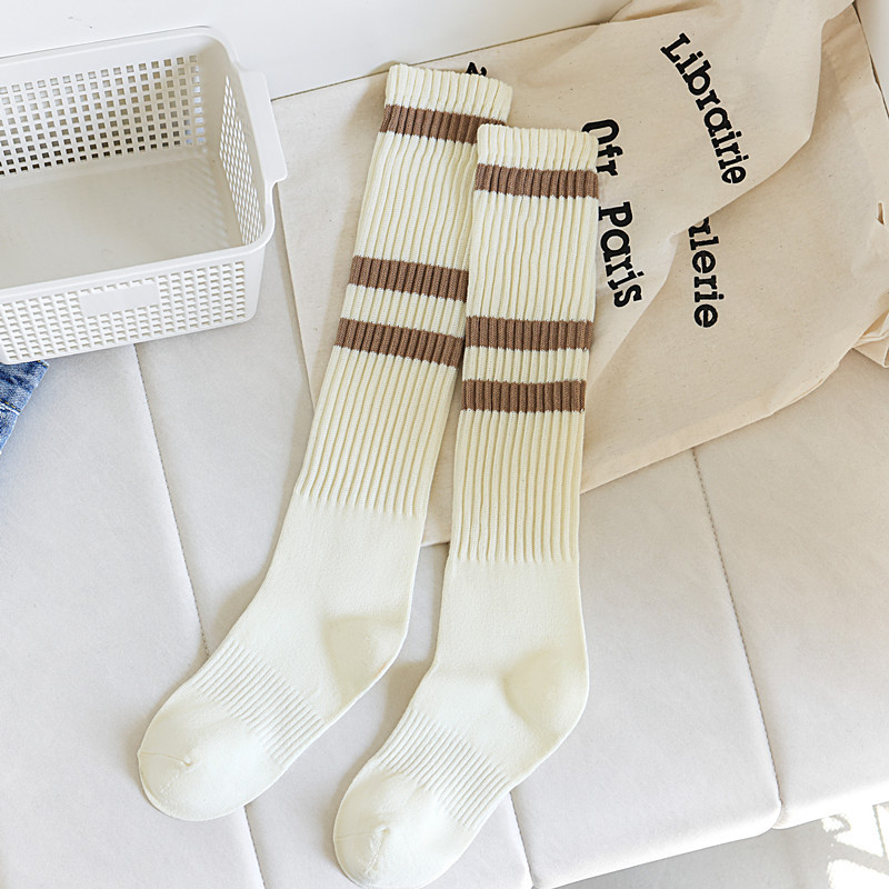가을과 겨울 프레피 스타일 코튼 스트라이프 송아지 양말 여성 한국식 무릎 길이 스포츠 캐주얼 화이트 컬러 스트라이프 더미 스타킹 조수