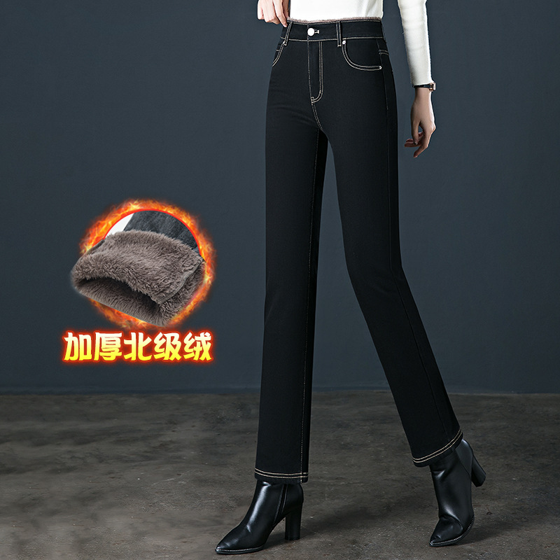 기모 두꺼운 청바지 여성의 높은 탄성 작은 스트레이트 따뜻한 바지 하이 웨이스트 슬리밍 연기 회색 중년 엄마 바지스토어 가기