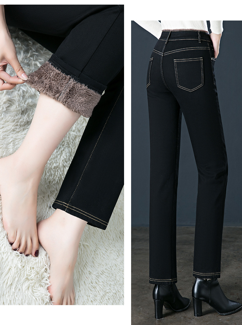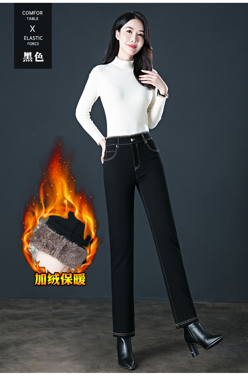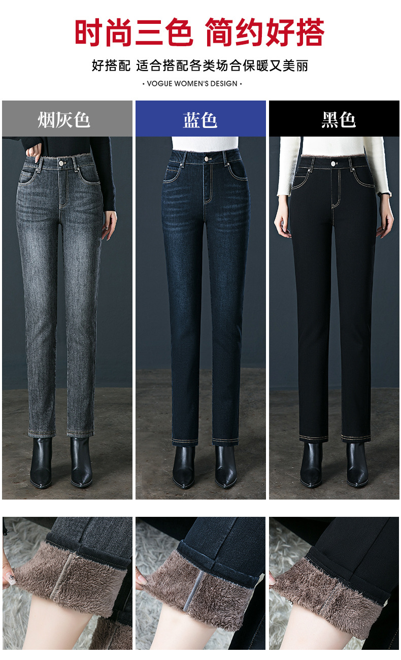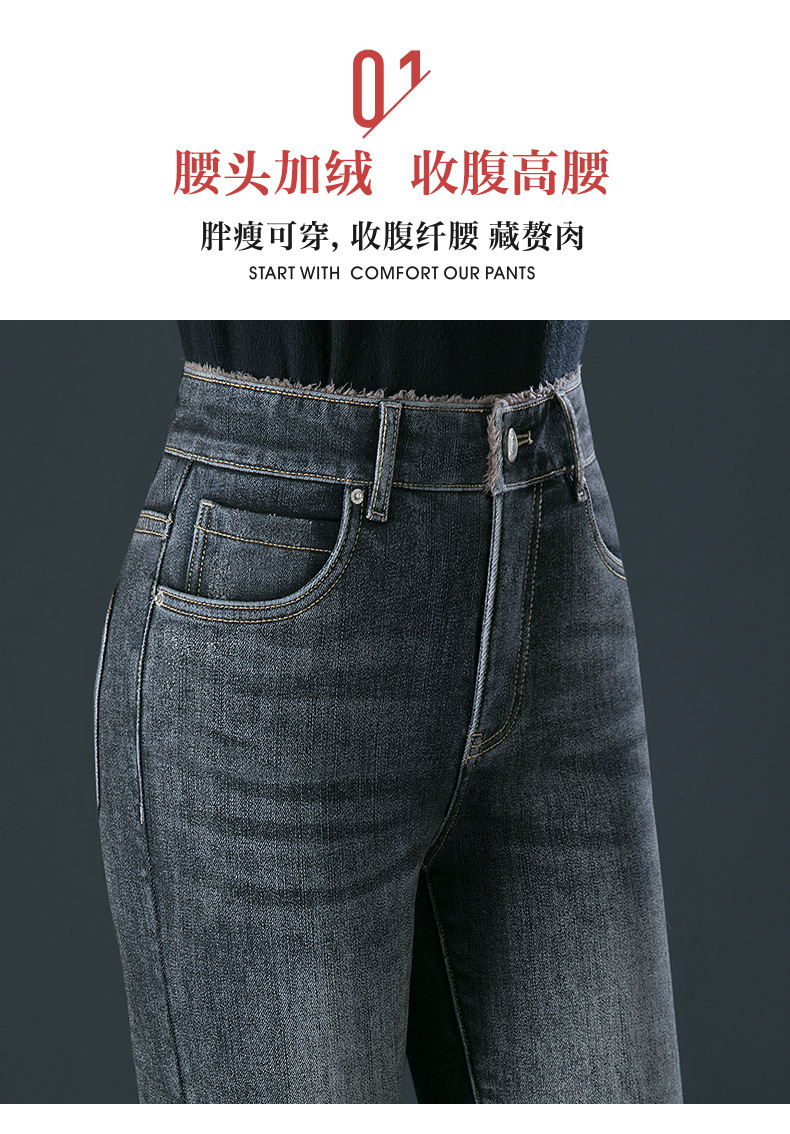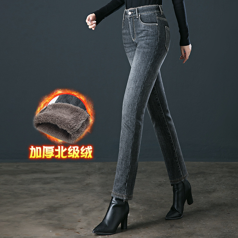기모 두꺼운 청바지 여성의 높은 탄성 작은 스트레이트 따뜻한 바지 하이 웨이스트 슬리밍 연기 회색 중년 엄마 바지