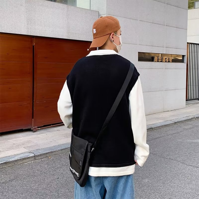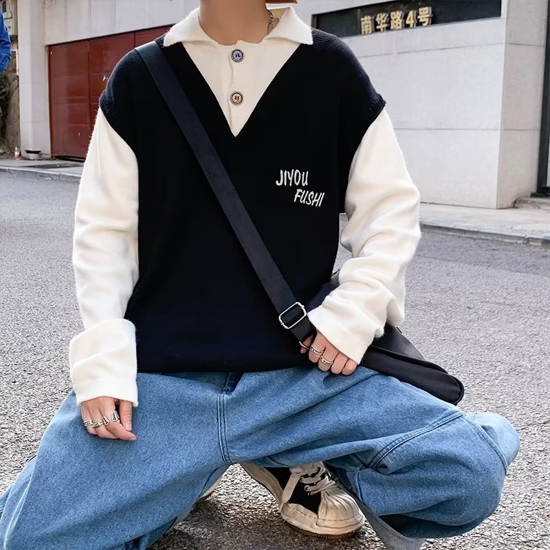 가짜 투피스 스웨터 남자의 가을과 겨울 두꺼운 느슨한 내부 재킷 겨울 패션 브랜드 게으른 스타일 일본 복고풍 니트 스웨터