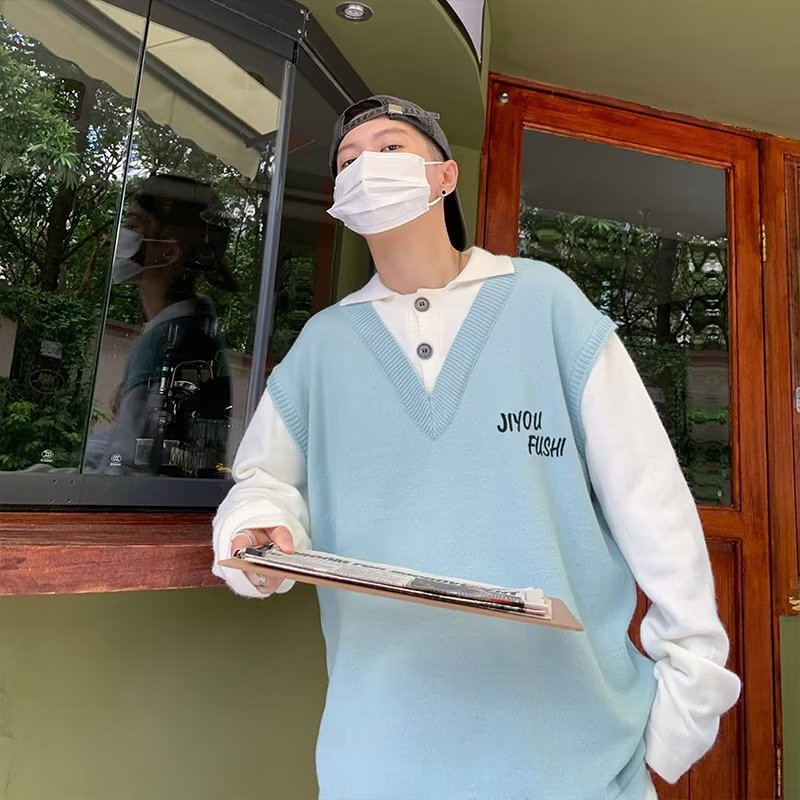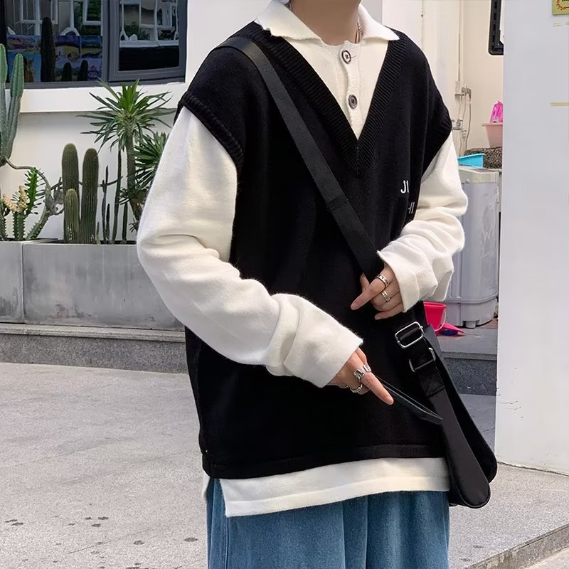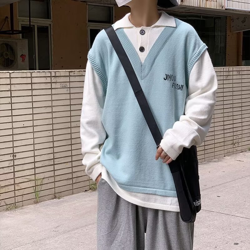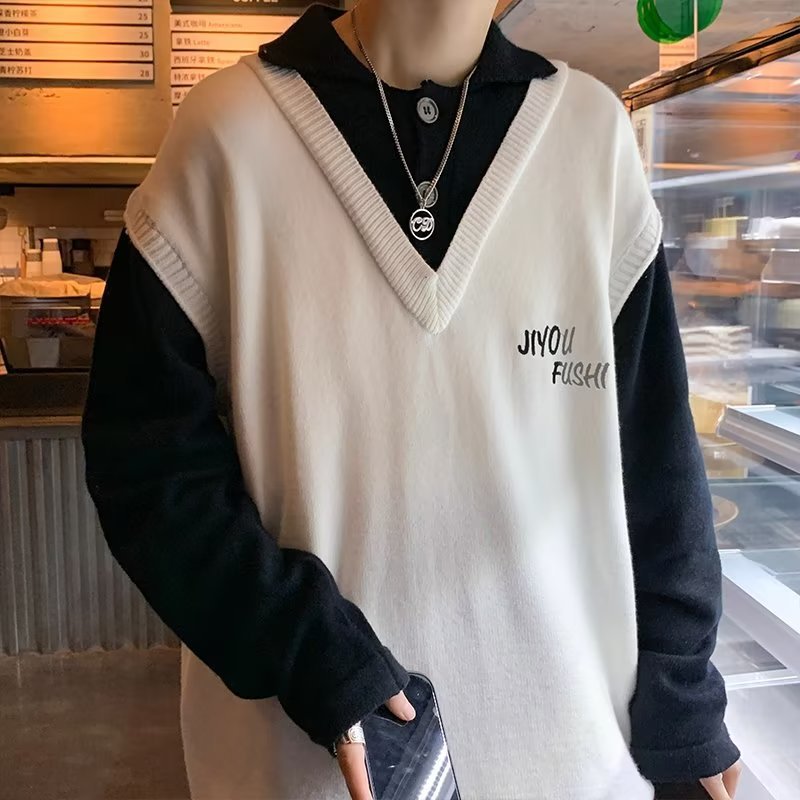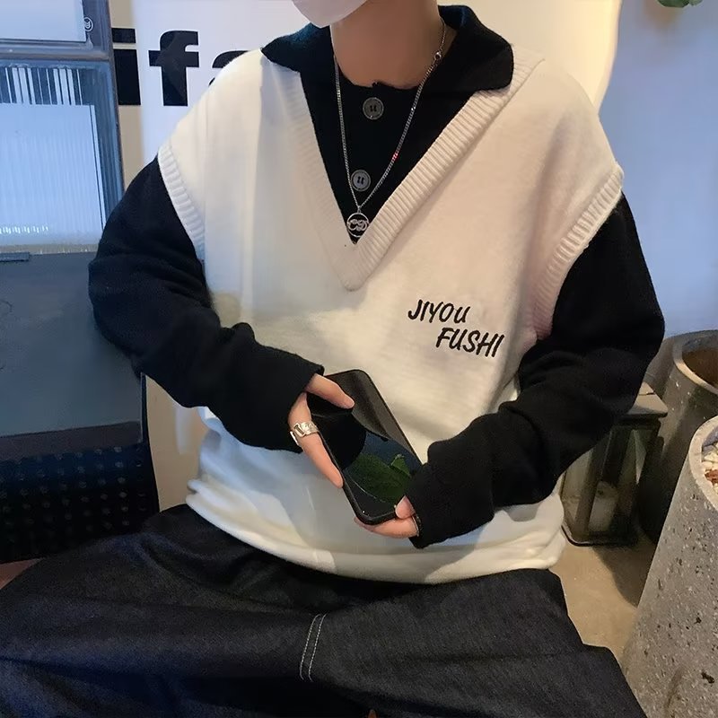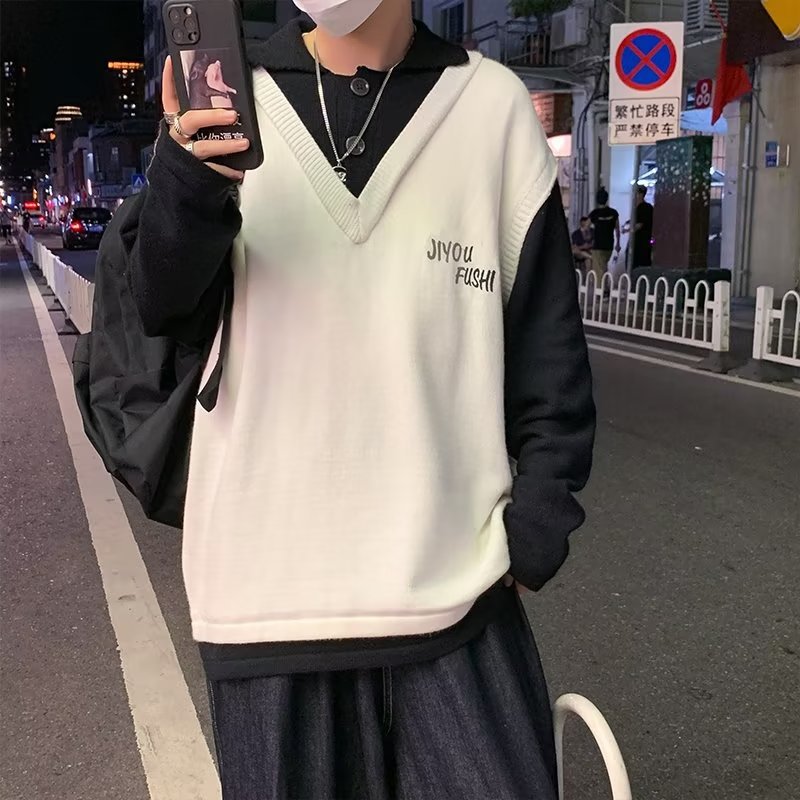 가짜 투피스 스웨터 남자의 가을과 겨울 두꺼운 느슨한 내부 재킷 겨울 패션 브랜드 게으른 스타일 일본 복고풍 니트 스웨터스토어 가기