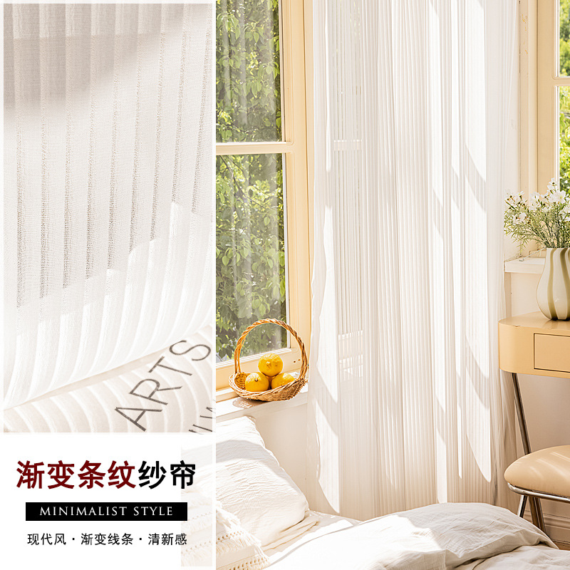 此款产品为渐变条纹柔纱产品,搭配广泛,ins网红风格。该窗帘为本公司自有品牌,质检严格,品质有保障。