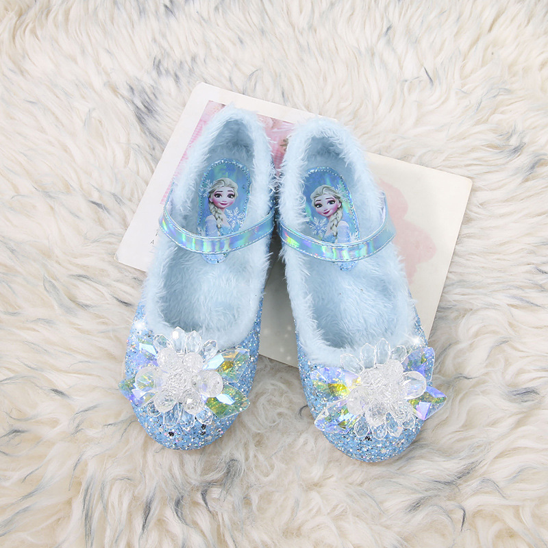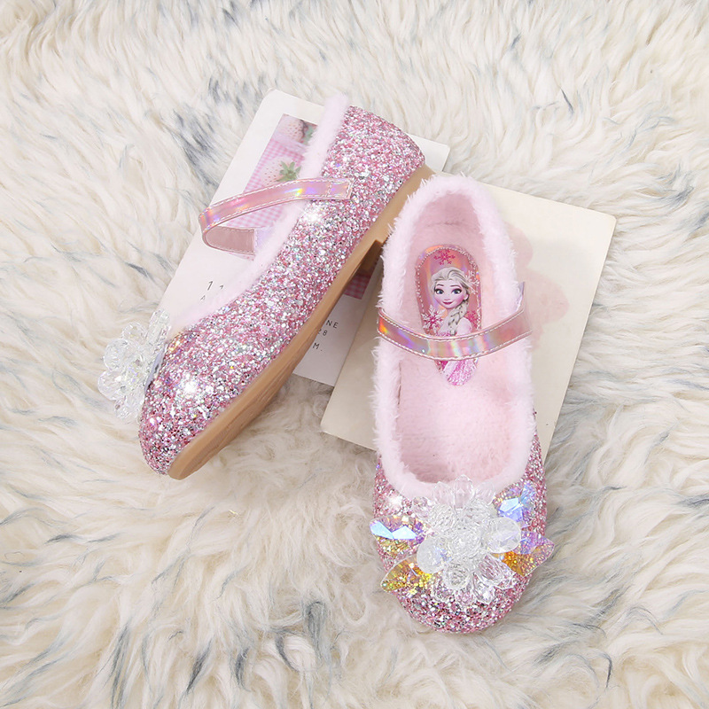 여자 면화 어린이 공주 신발 2024 봄 새로운 패션 따뜻한 모피 엘사 크리스탈 작은 가죽 어린이 신발