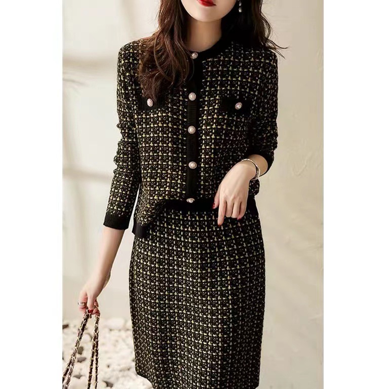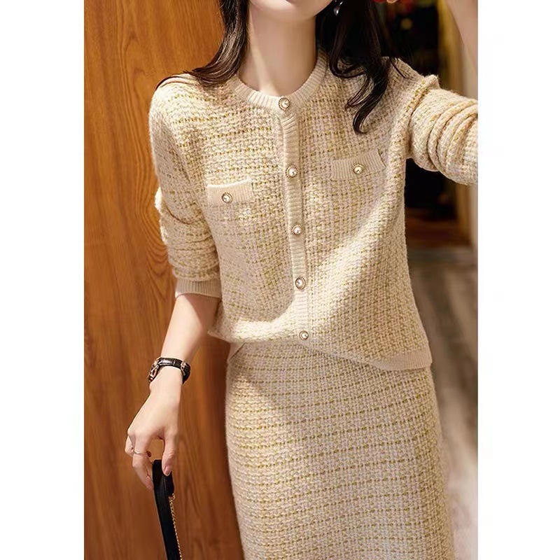 이른 가을 빛 사회 분위기 인간 산책 샤넬 스타일 울 캐시미어 니트 소프트 세트 여성의 가을과 겨울 스웨터 원피스