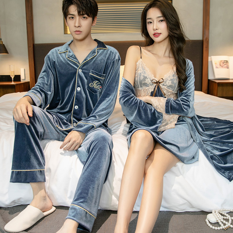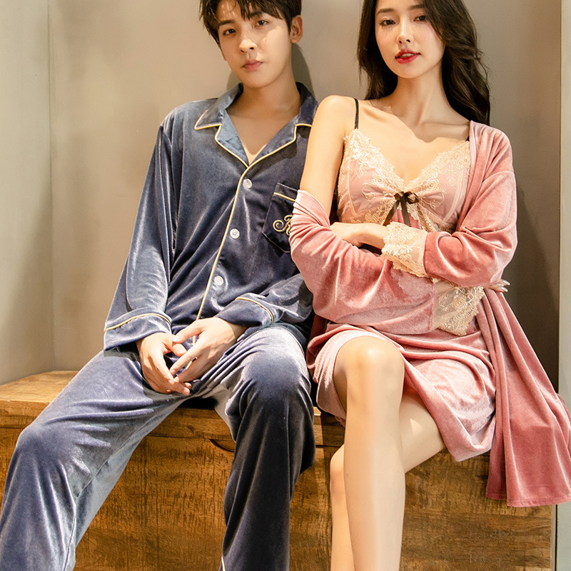 섹시한 잠옷 여성 봄과 가을 커플 새로운 가을과 겨울 레이스 감각 골드 벨벳 멜빵 드레싱 가운 세트스토어 가기