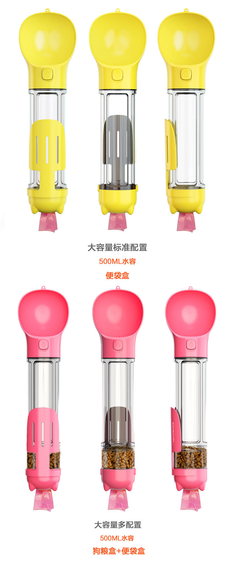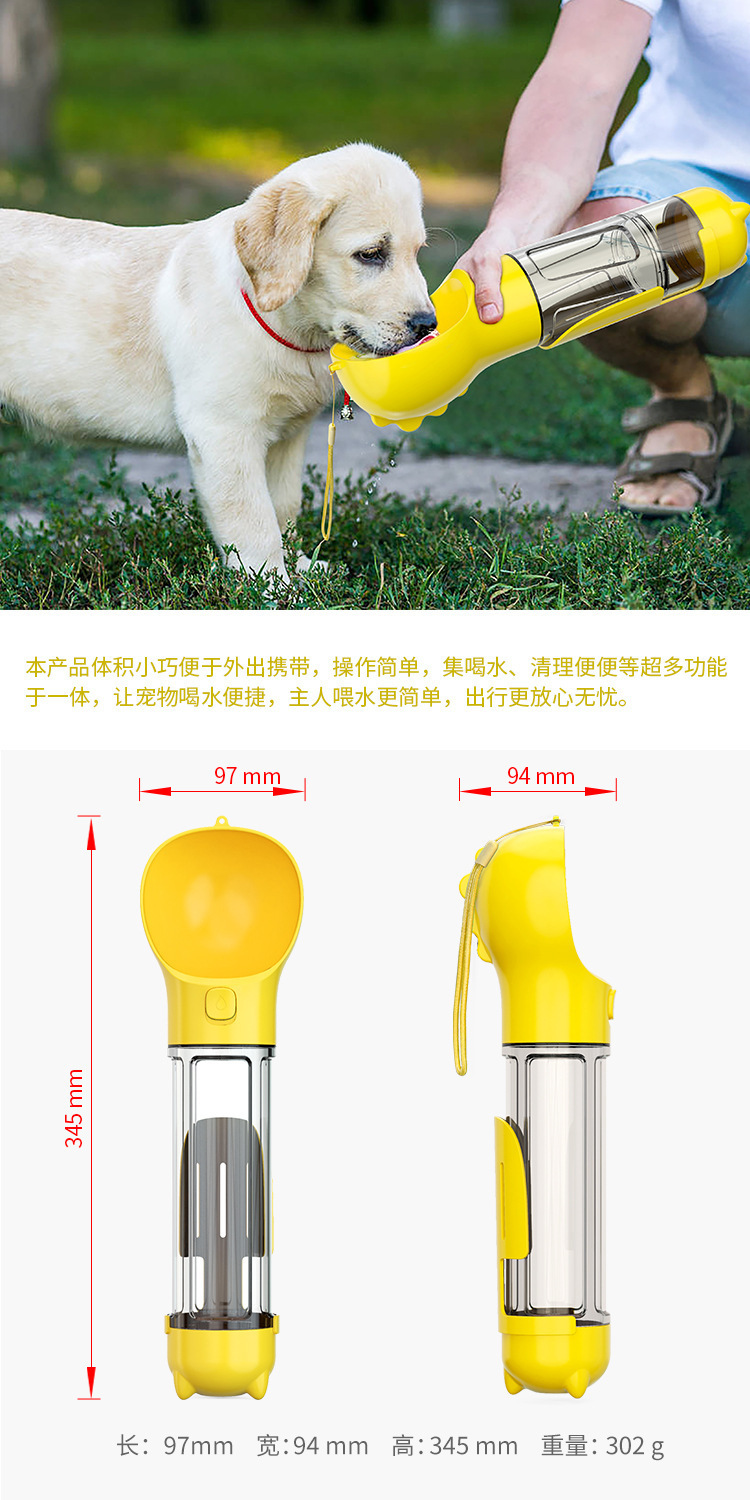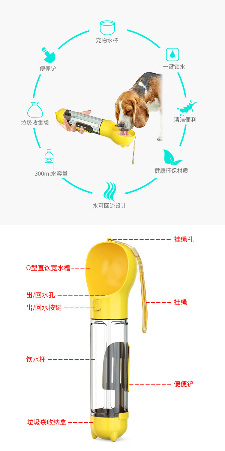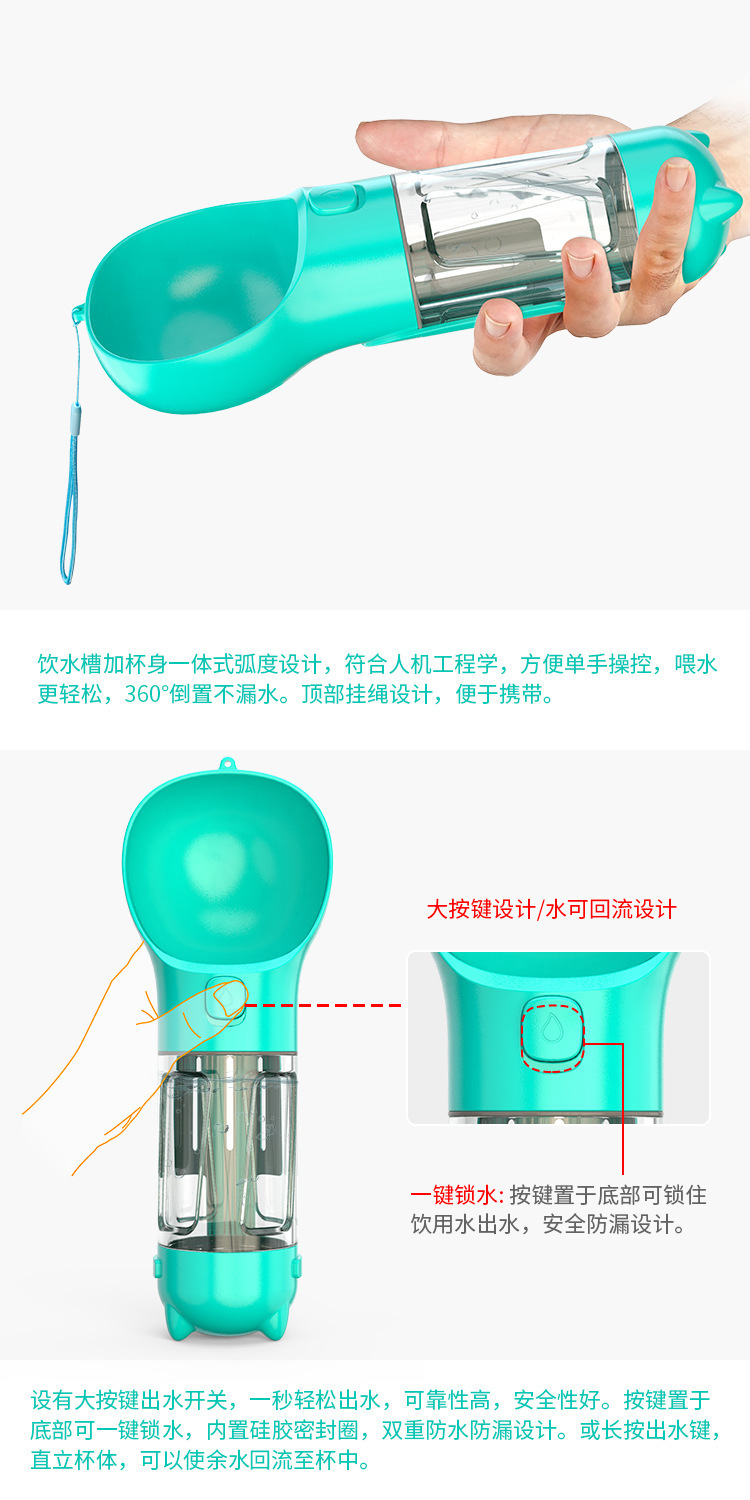本公司原创设计产品,多功能便携式宠物旅行水杯,使用新型环保材料制作,耐高温,可使用洗碗机清洗不变形、不漏水。可单手操控、喂水更轻松。大按键设计一键出水还可回流。更附加了宠物粪便清理铲与宠物粪便收纳袋功能。
