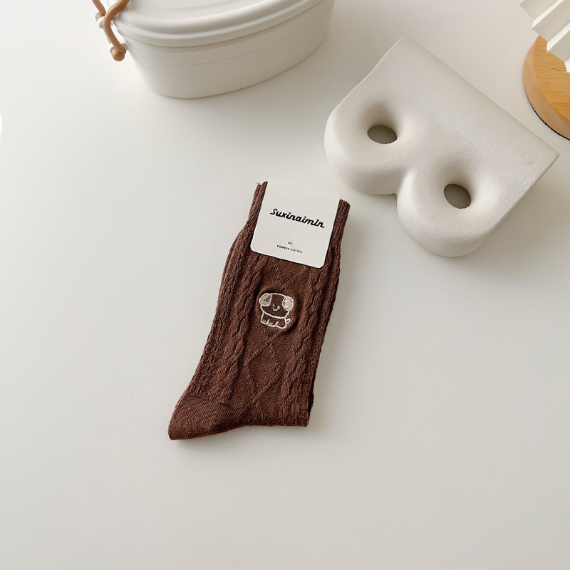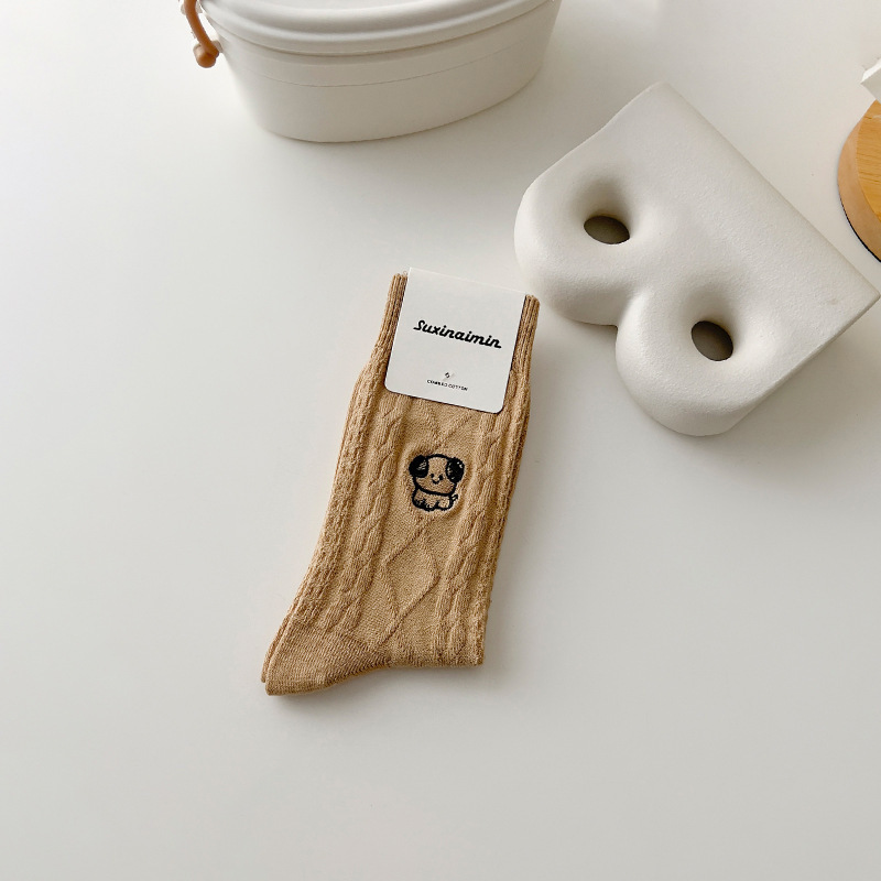 가을과 겨울 여성 양말 단색 능형 양말 여성용 최신 유행 일본식 귀여운 자수 강아지 스택 자수 면 양말