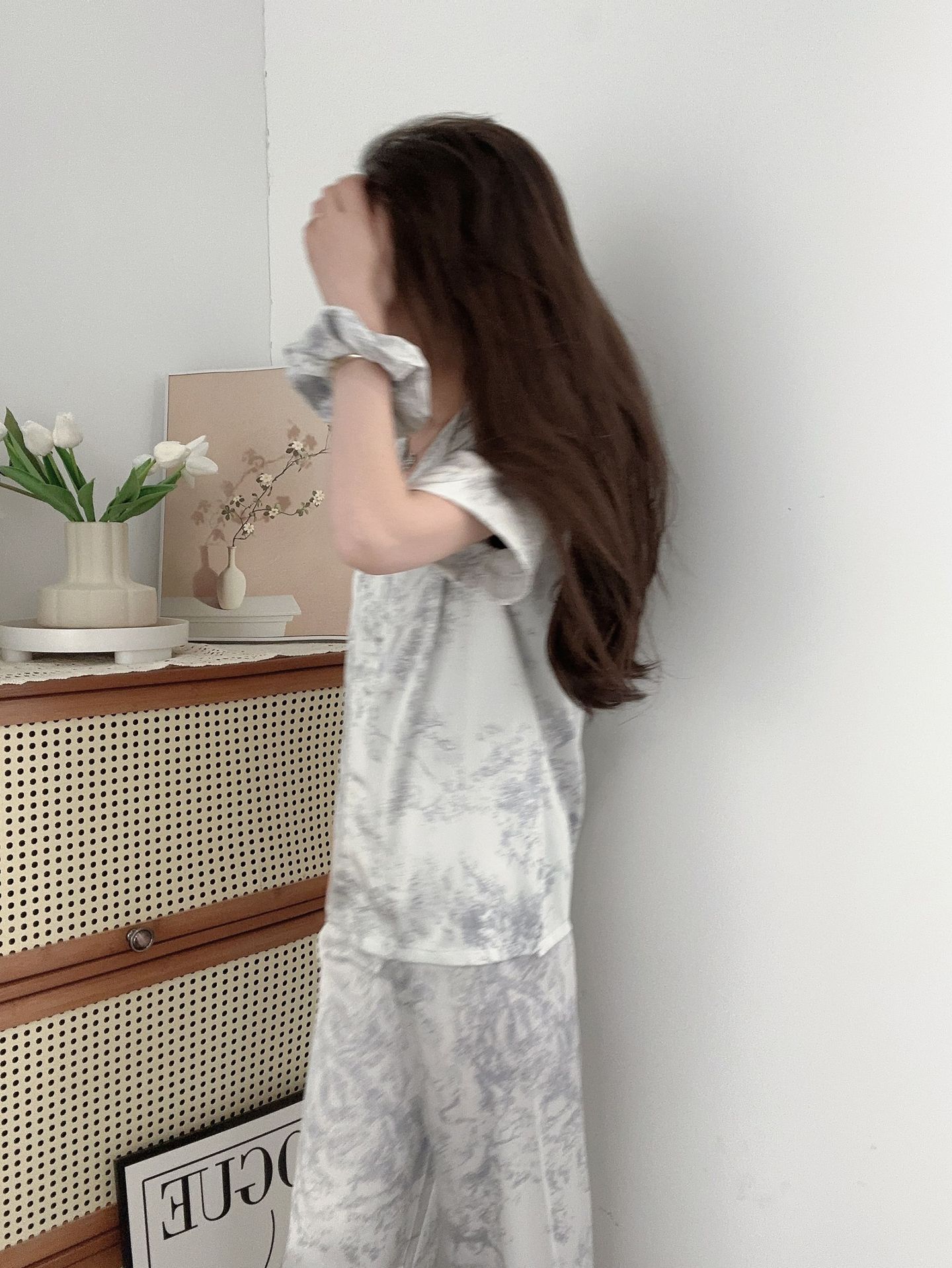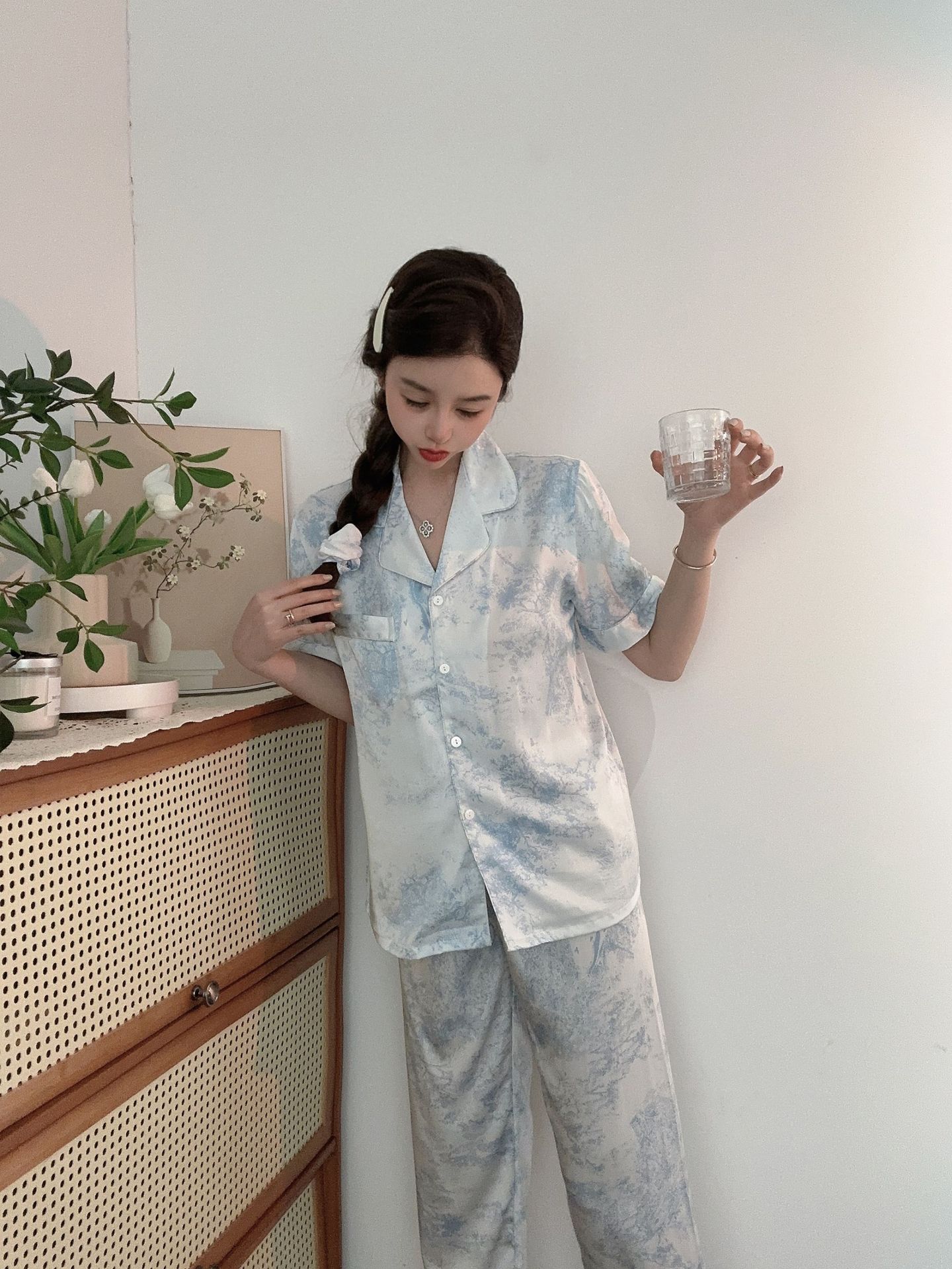 야세【정글 부시】2025 신상 여성용 잠옷 봄 가을 고급스러운 아이스 실크 홈웨어 머리끈 포함