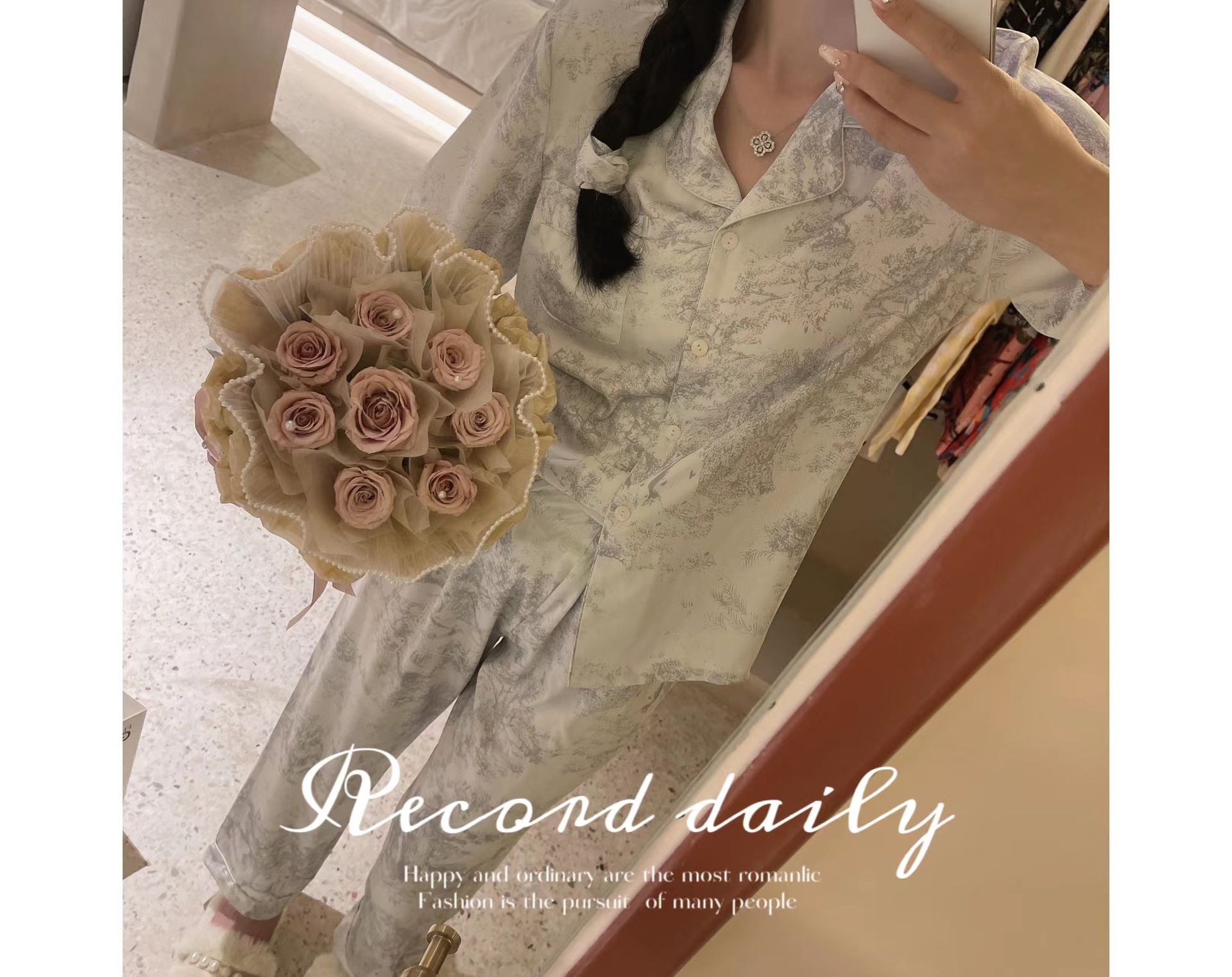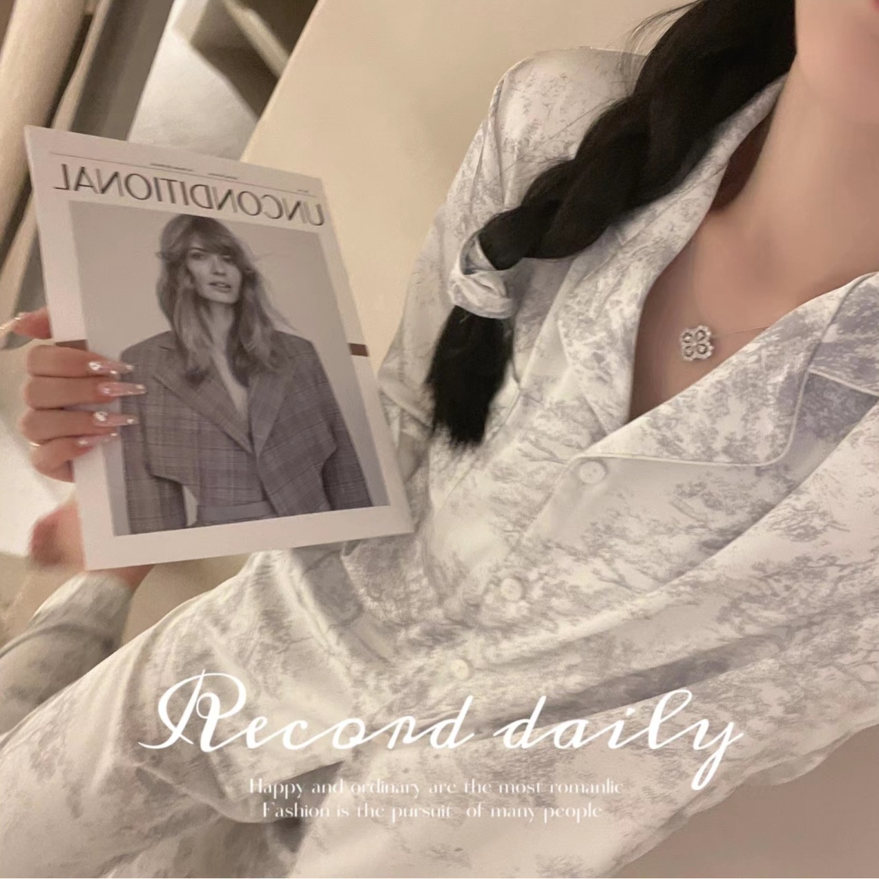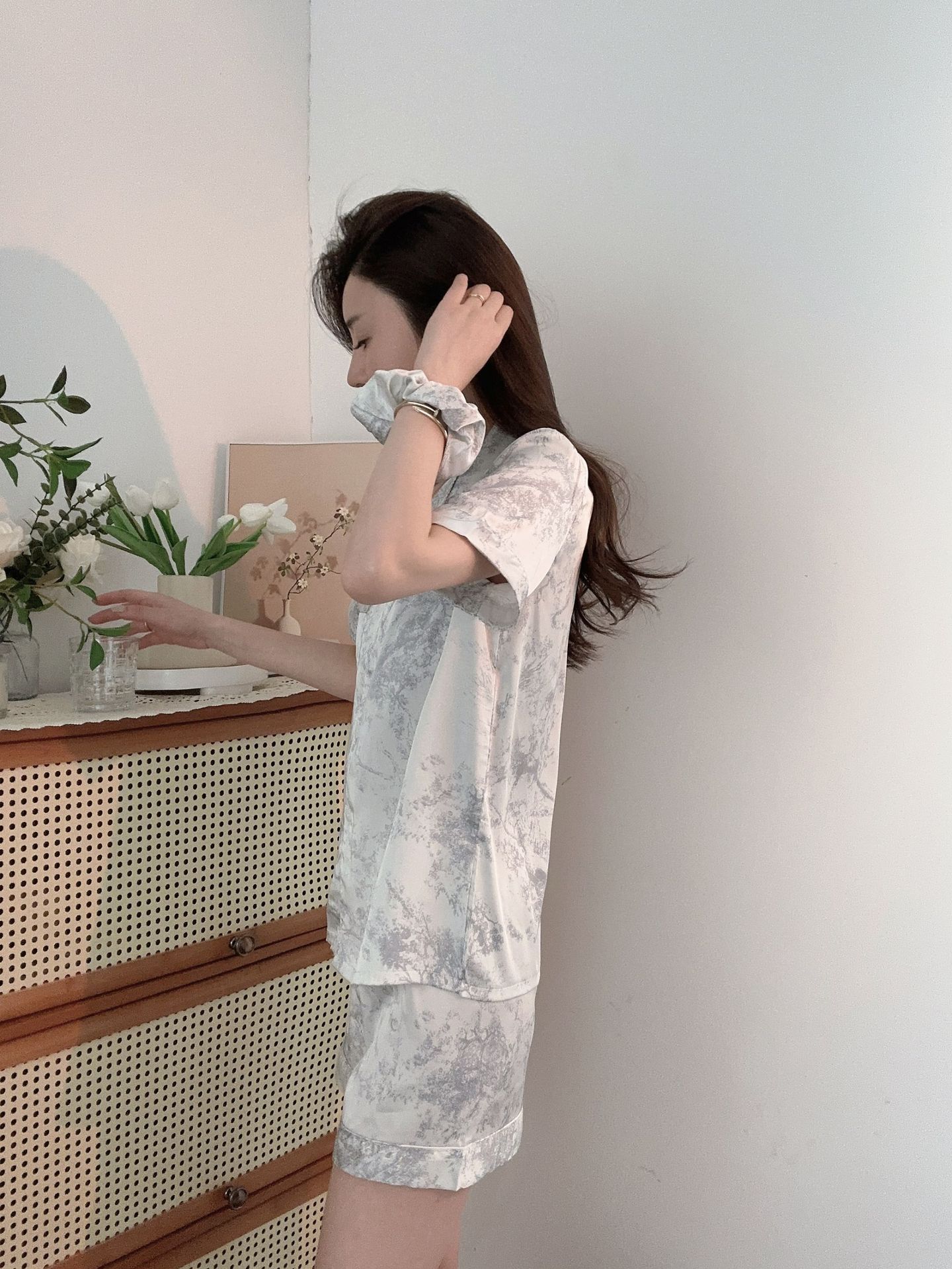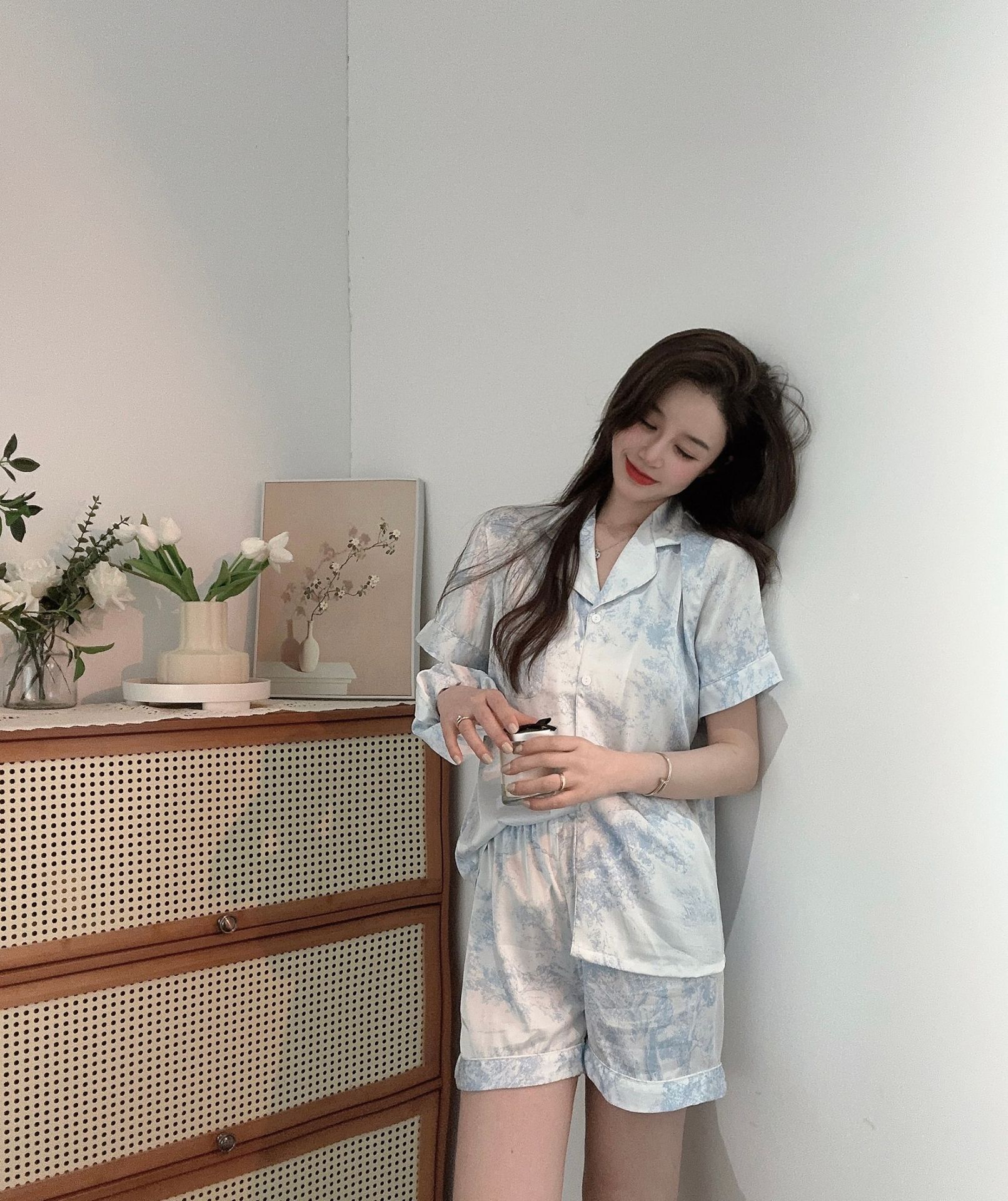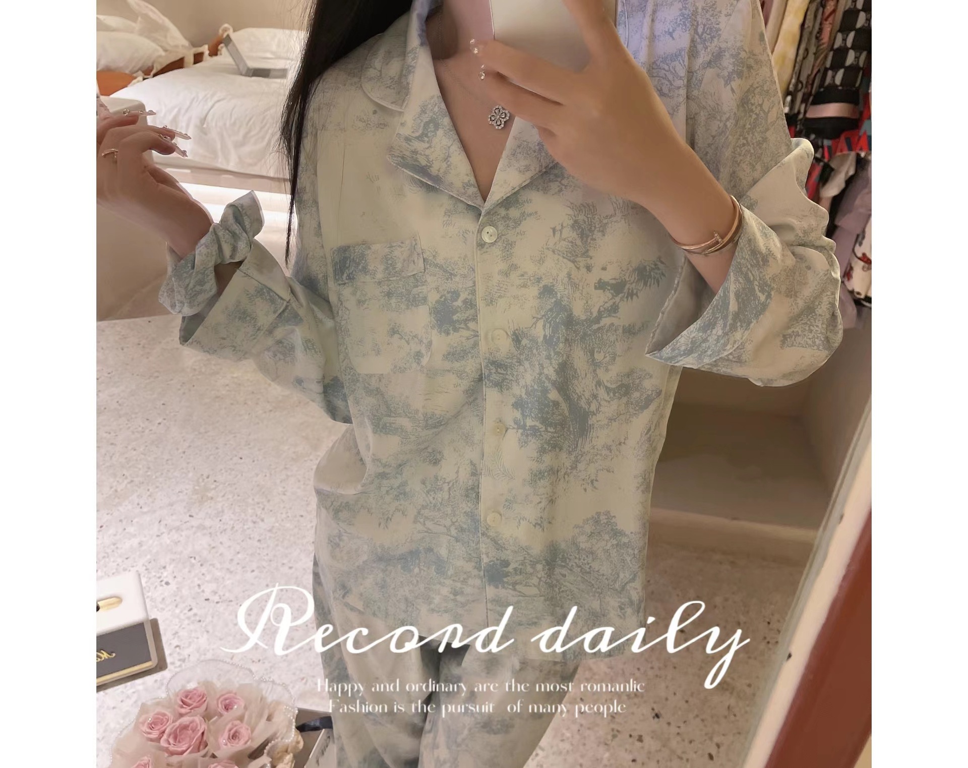 야세【정글 부시】2025 신상 여성용 잠옷 봄 가을 고급스러운 아이스 실크 홈웨어 머리끈 포함스토어 가기