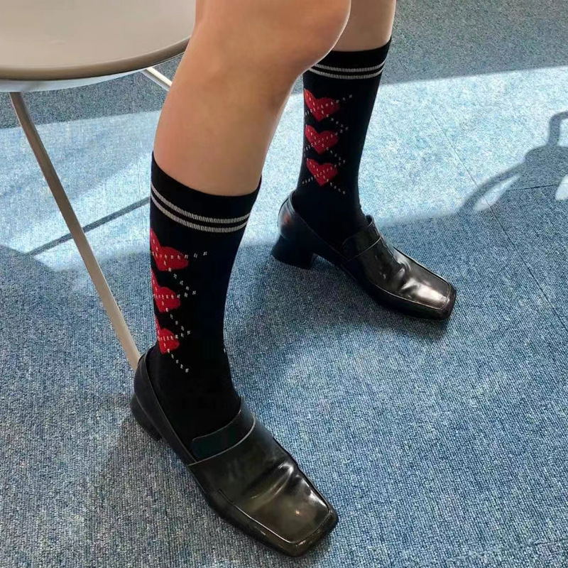 동대문 패션 브랜드 사랑 종아리 양말 한국 인 스타일 2 바 스트라이프 빅 피치 하트 여성용 양말 하이 코튼 양말스토어 가기