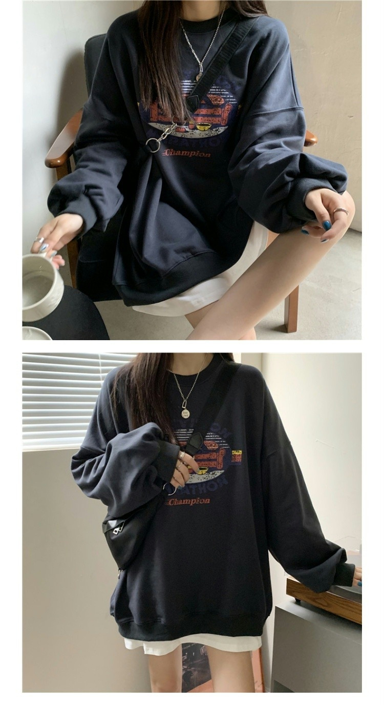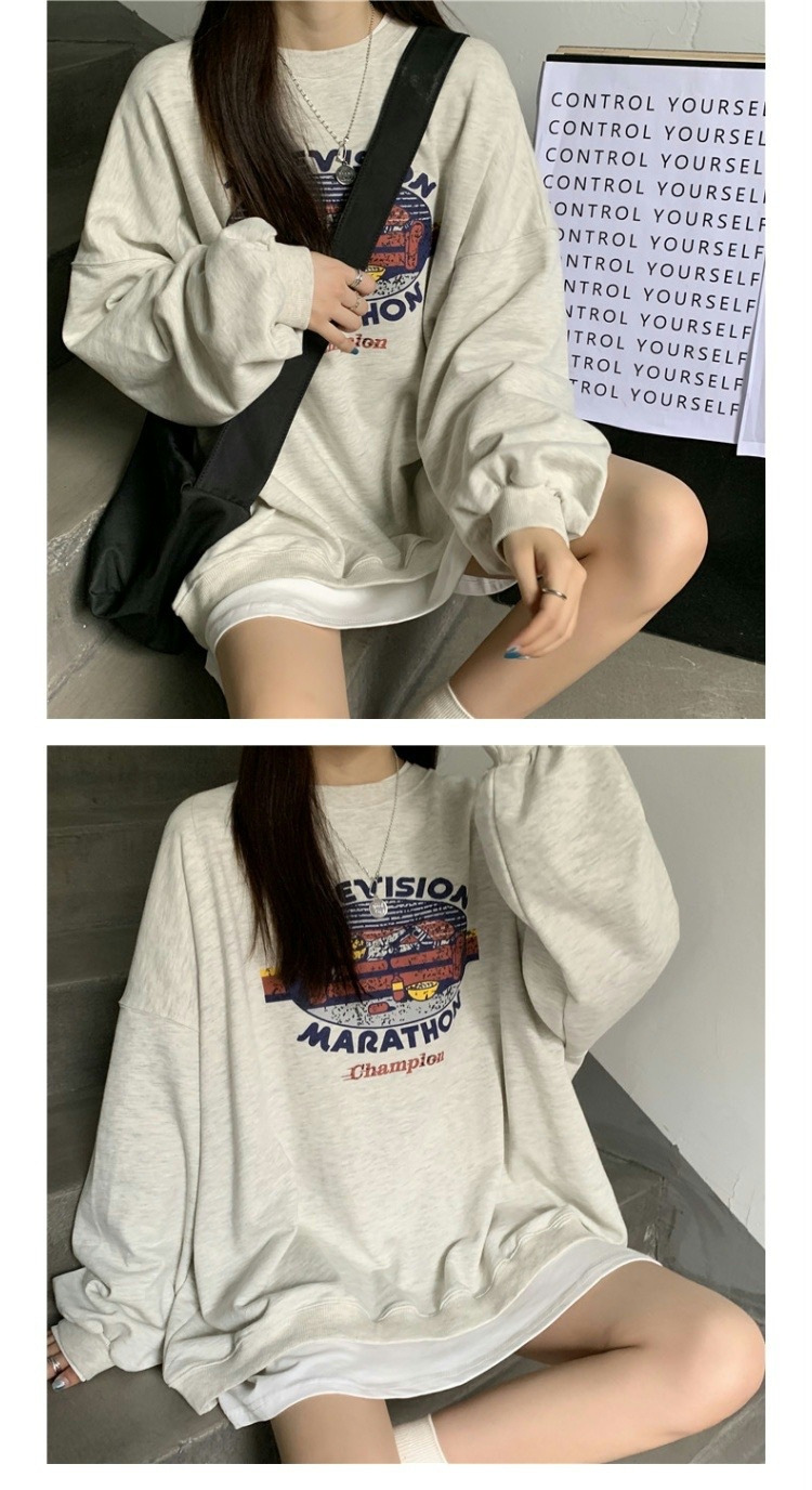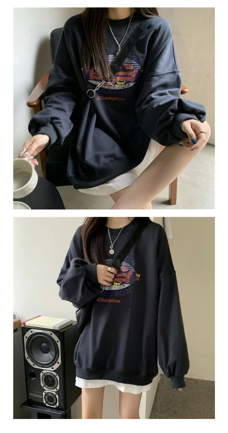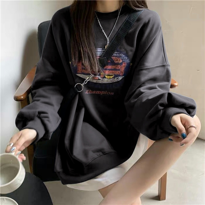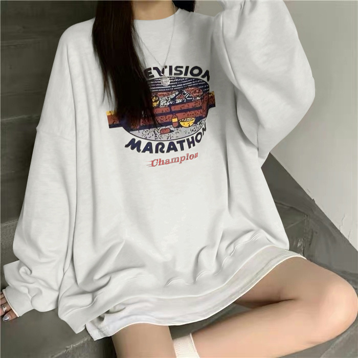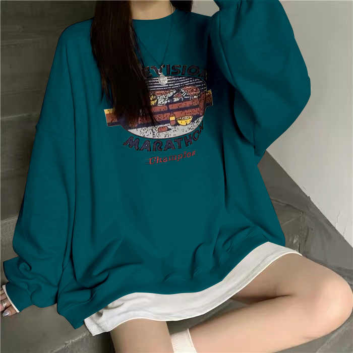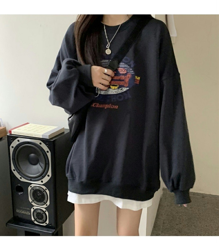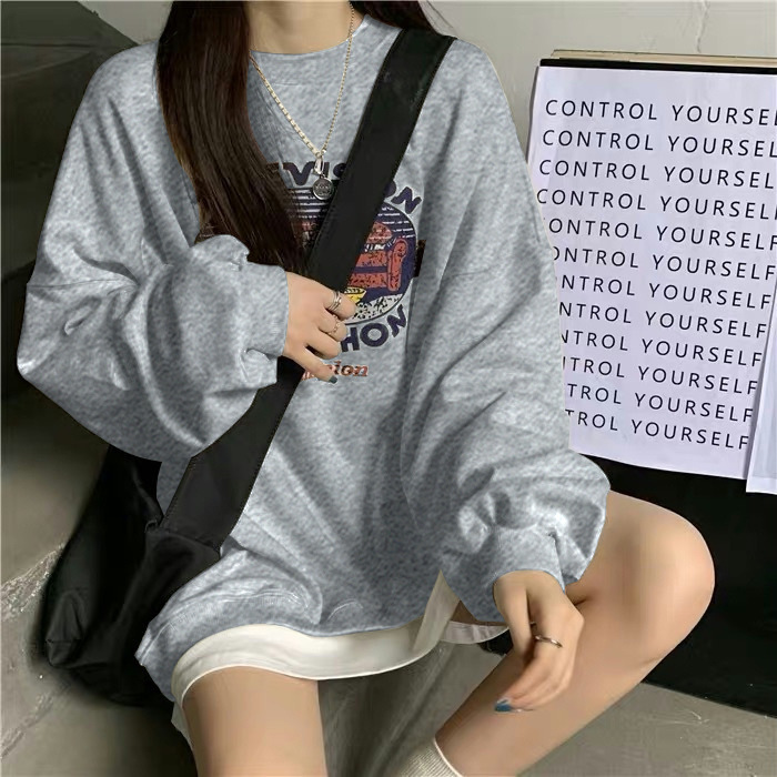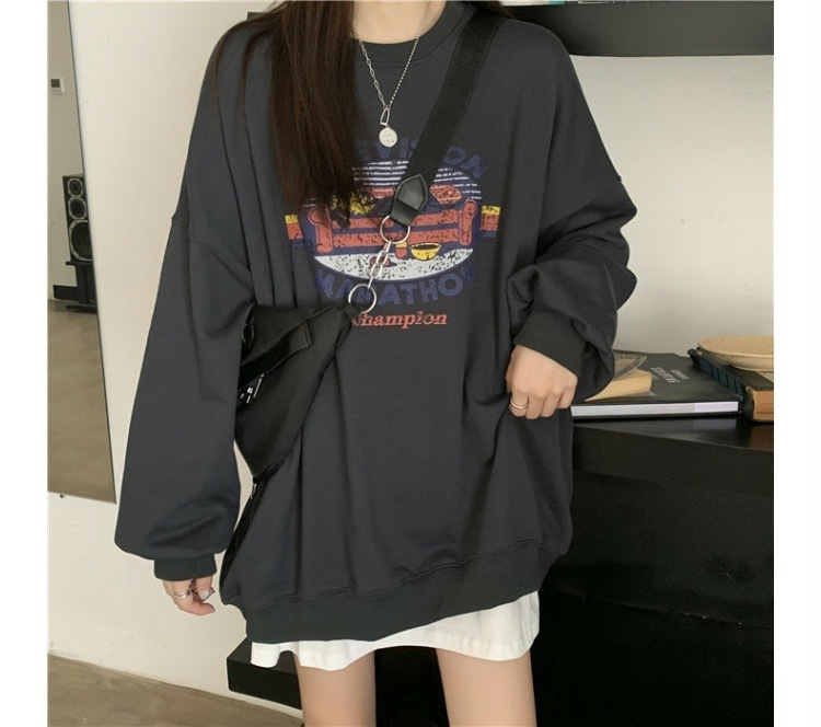 아메리칸 스타일 레트로 프린트 라운드 넥 스웨터 여자의 가을 의류 학생 베이스 셔츠 정사이즈 캐주얼 느슨한 탑 얇은 유행스토어 가기