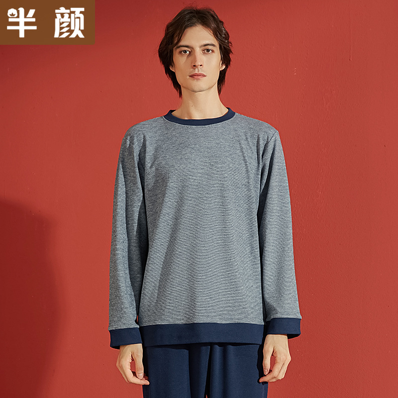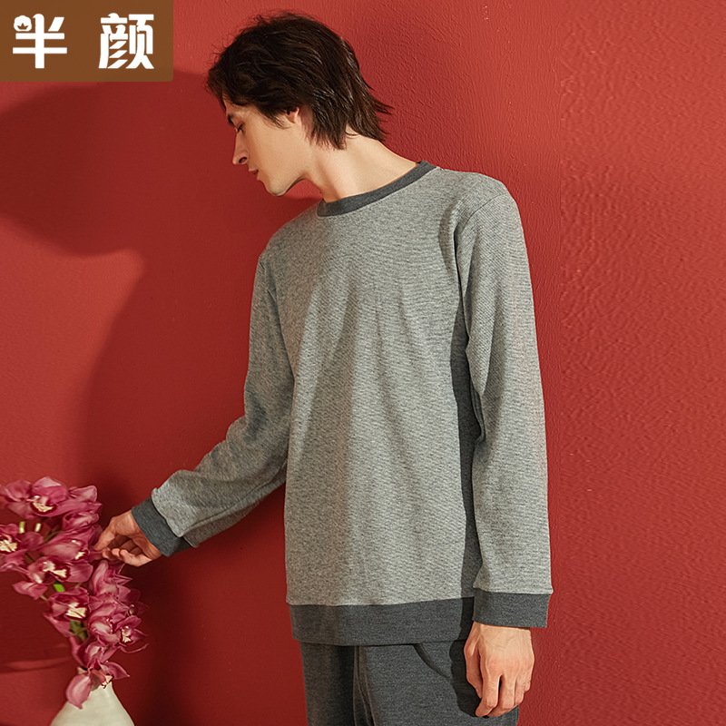 半颜秋冬暖绒新 情侣针织加厚磨毛色纺彩纱细条纹柔软圆领睡衣套