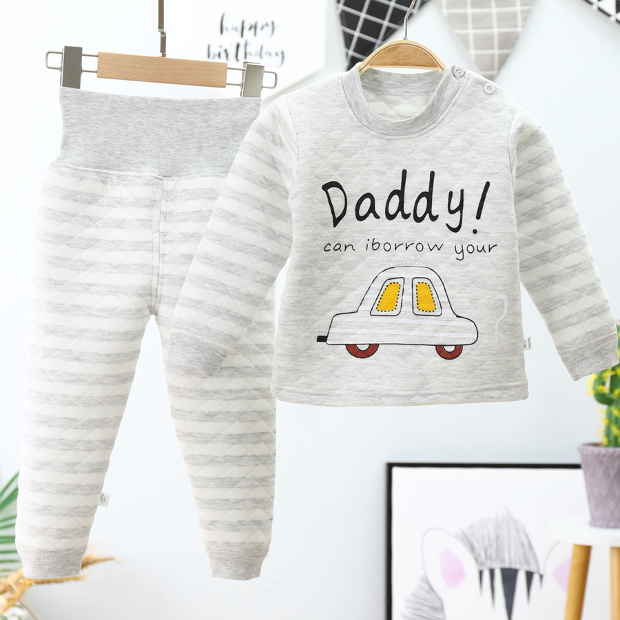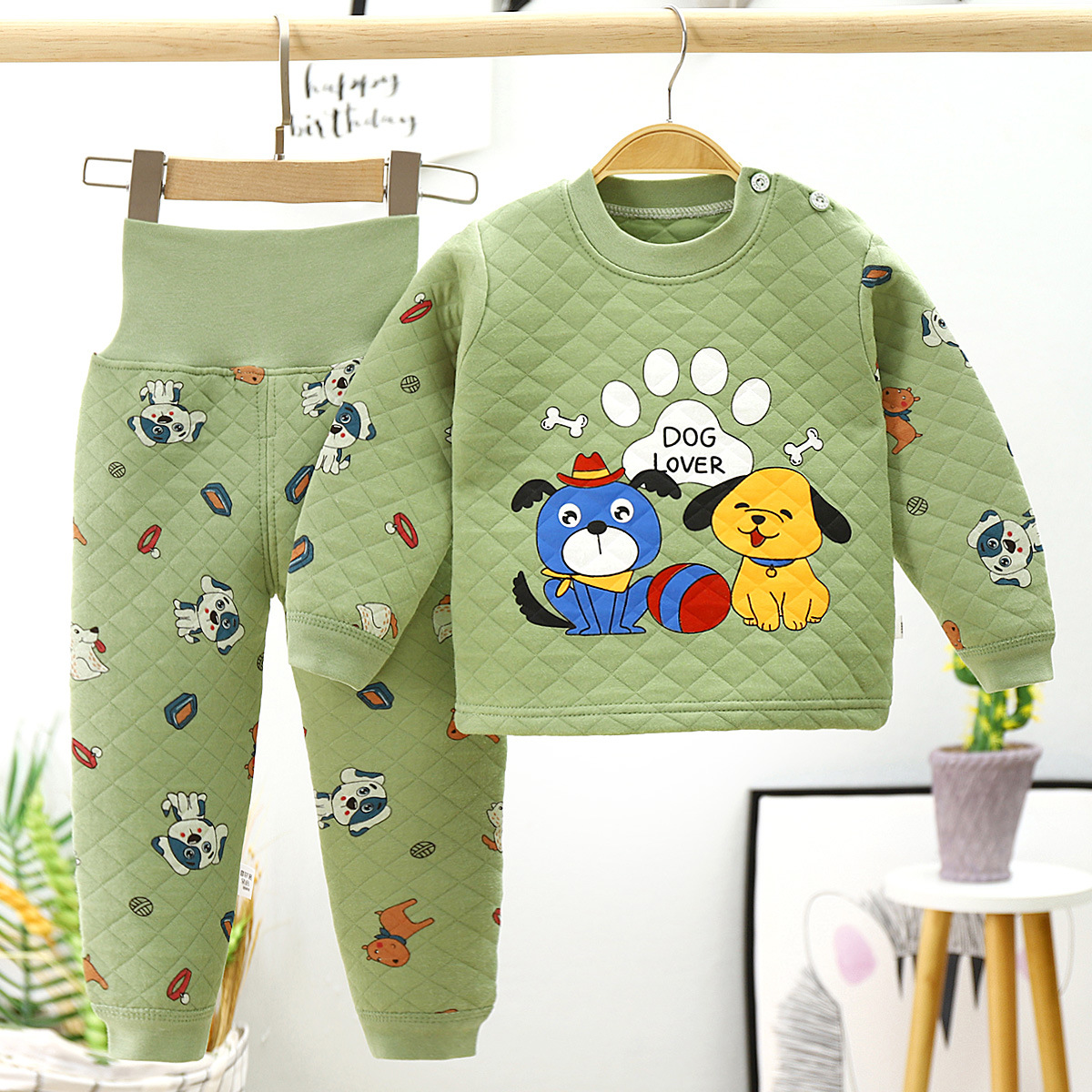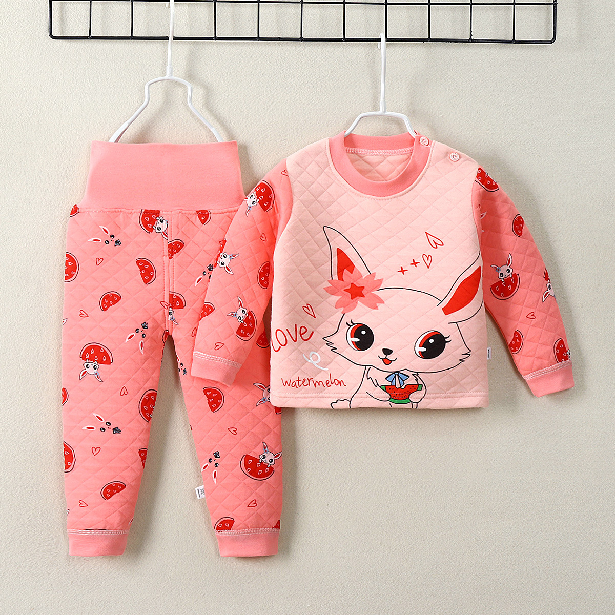 本款产品为三层夹棉儿童高腰裤套装,精选纯棉面料,三层夹棉保暖内衣套装柔软舒适,不刺激宝宝皮肤,环保印染,精美花型,让宝妈们更多选择!精心高腰裤设计,防止宝宝晾着肚子!上衣肩开扣设计,方便宝宝穿脱!