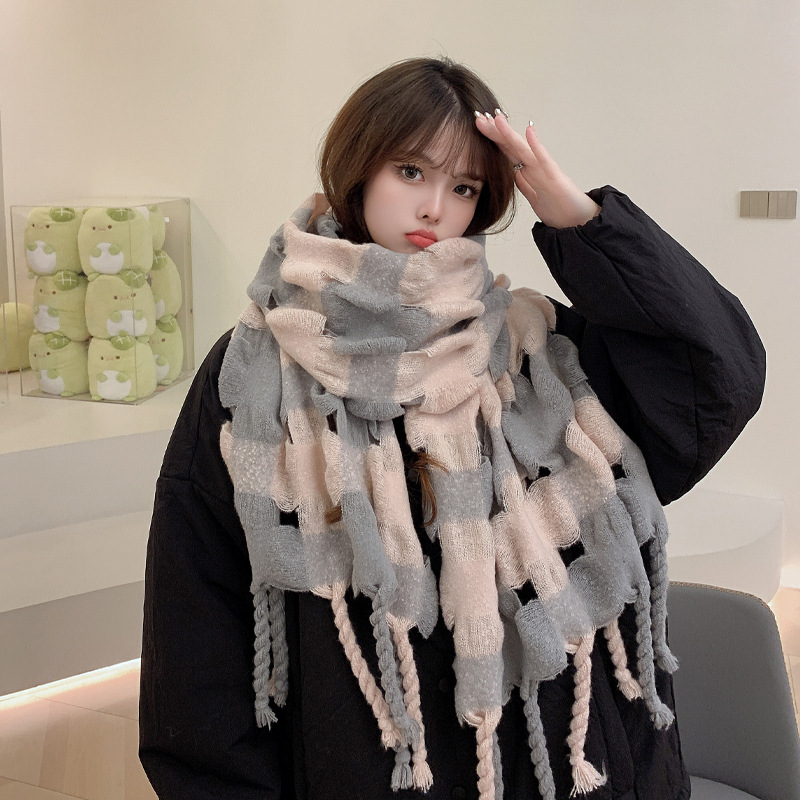 2022 새로운 중공 꽃 색상 매칭 사각 격자 무늬 스카프 패션 두꺼운 따뜻한 모든 매치 레이디 숄 스카프스토어 가기