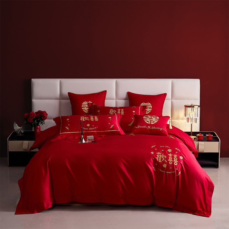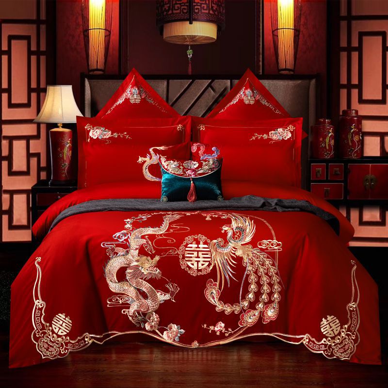 중국면 클래스 100 결혼식 4 피스 용과 피닉스 자수 결혼식 큰 붉은 면화 결혼식 침구스토어 가기