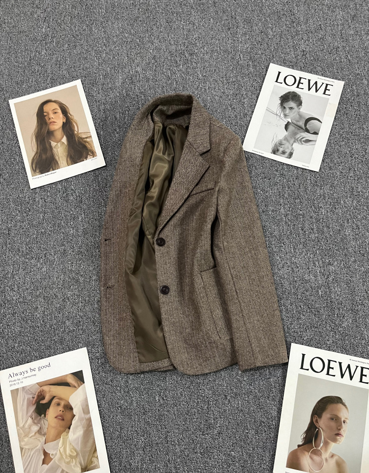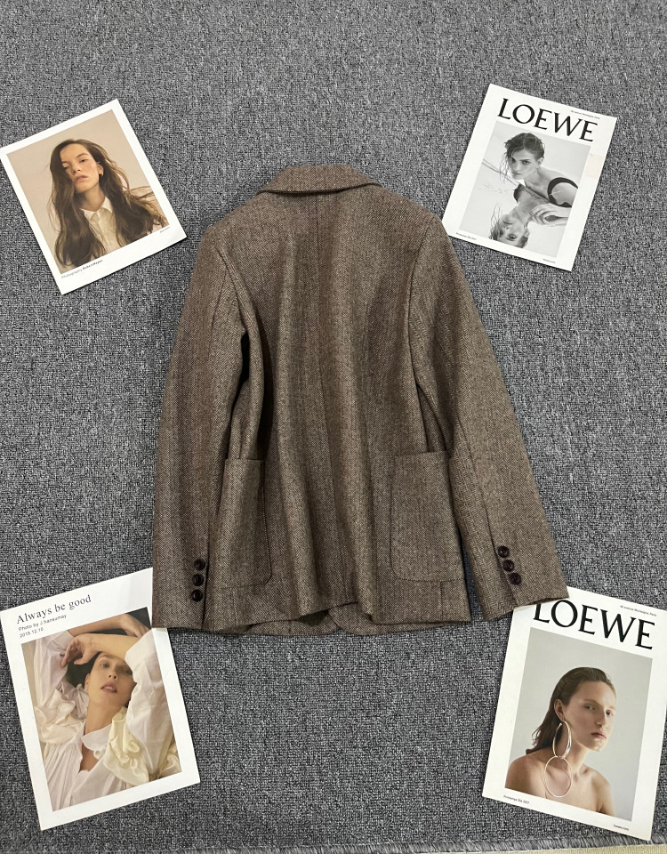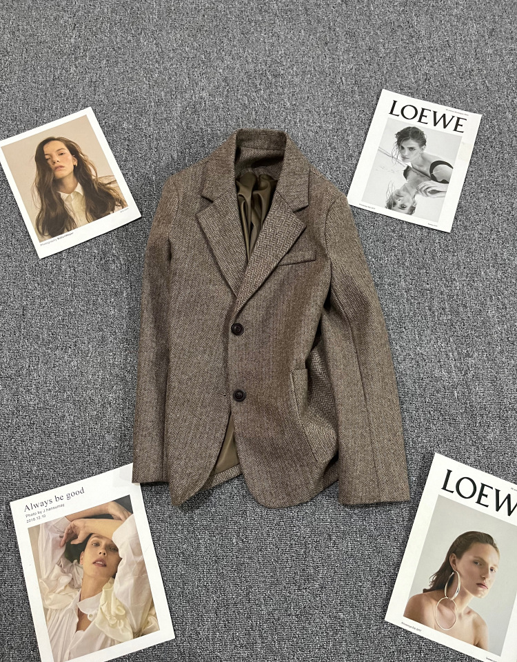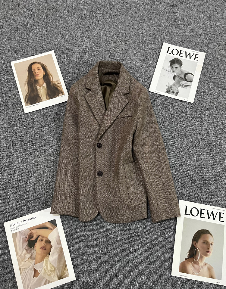 여성을위한 갈색 헤링본 모직 정장 재킷 2025 새로운 가을, 겨울 디자인 다목적 캐주얼 스트리트 슈트스토어 가기