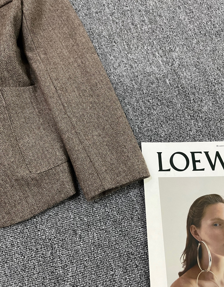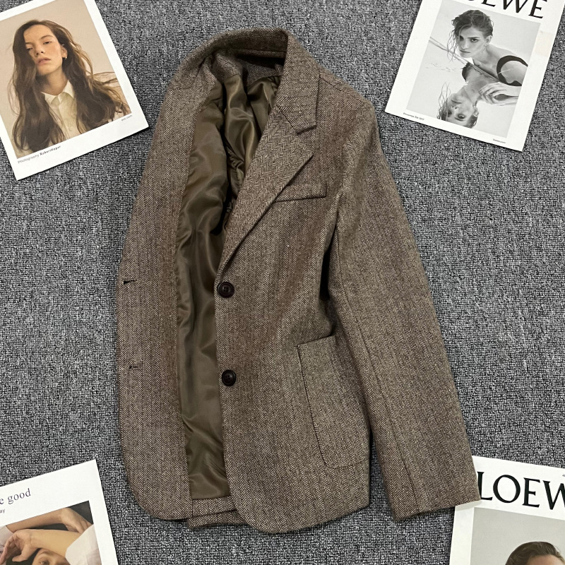 여성을위한 갈색 헤링본 모직 정장 재킷 2025 새로운 가을, 겨울 디자인 다목적 캐주얼 스트리트 슈트