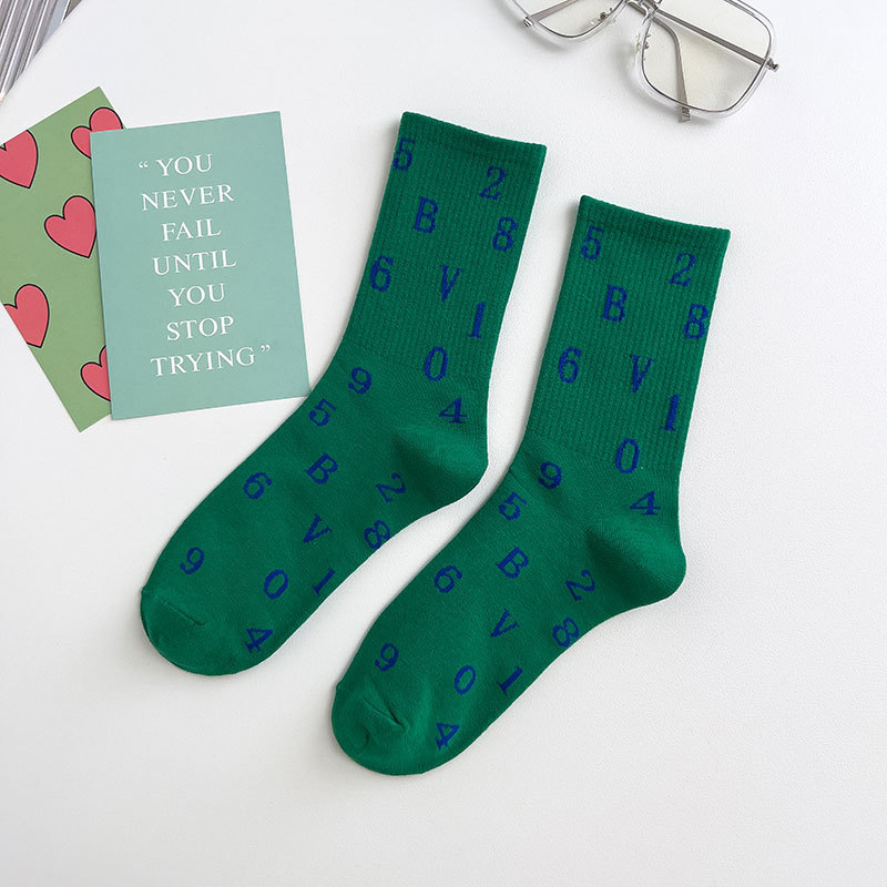 Zhuji 양말 여성용 봄과 여름 얇은 일본 연애 편지 중간 길이 양말 녹색 사이버 축하 바둑판 스포츠 양말