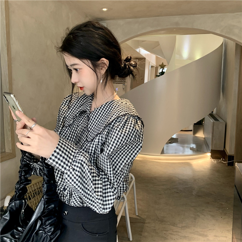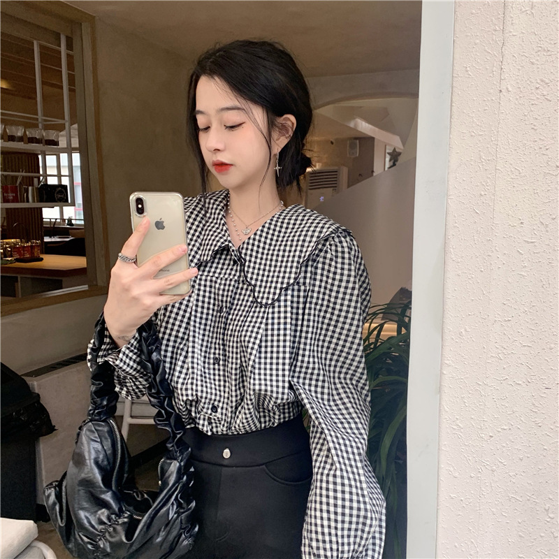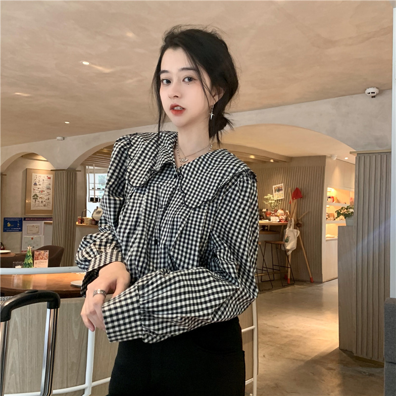 긴팔 격자 무늬 셔츠 여성 디자인 센스 니쉬 봄과 가을 새로운 올 매치 레트로 홍콩 스타일 프랑스 인형 칼라 탑