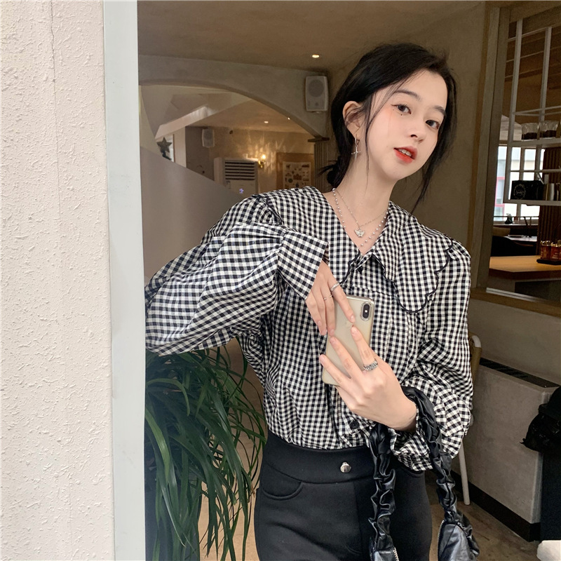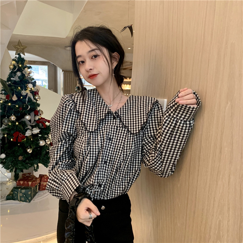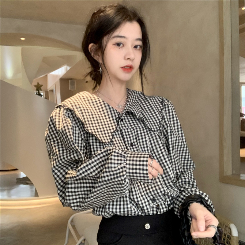 긴팔 격자 무늬 셔츠 여성 디자인 센스 니쉬 봄과 가을 새로운 올 매치 레트로 홍콩 스타일 프랑스 인형 칼라 탑스토어 가기