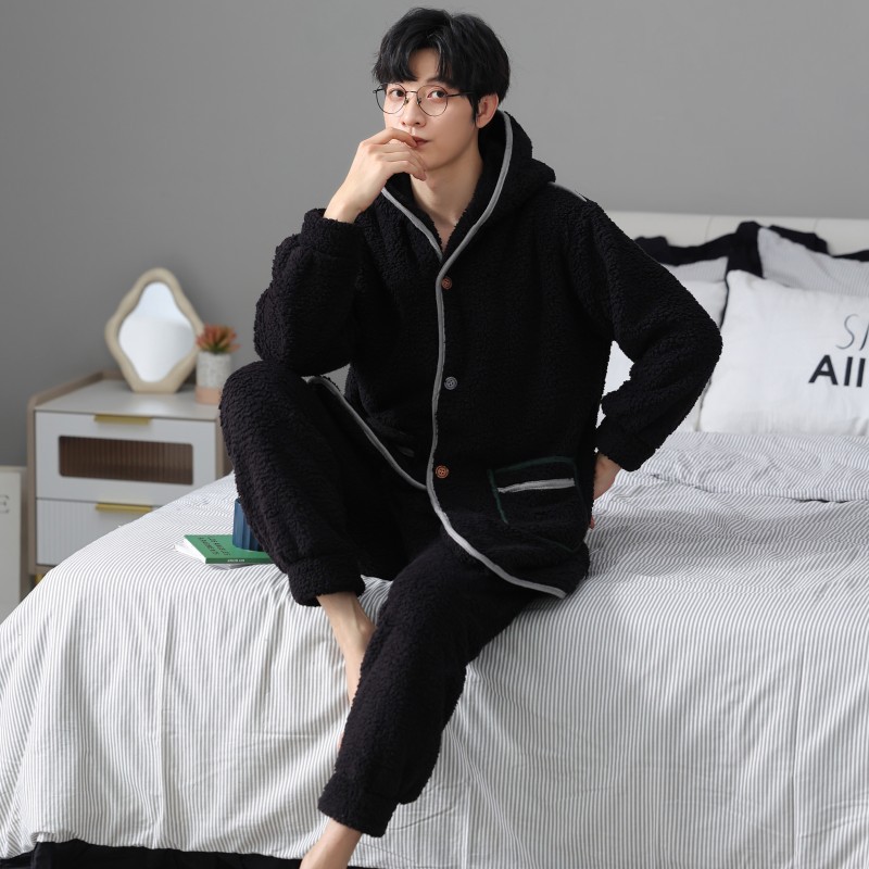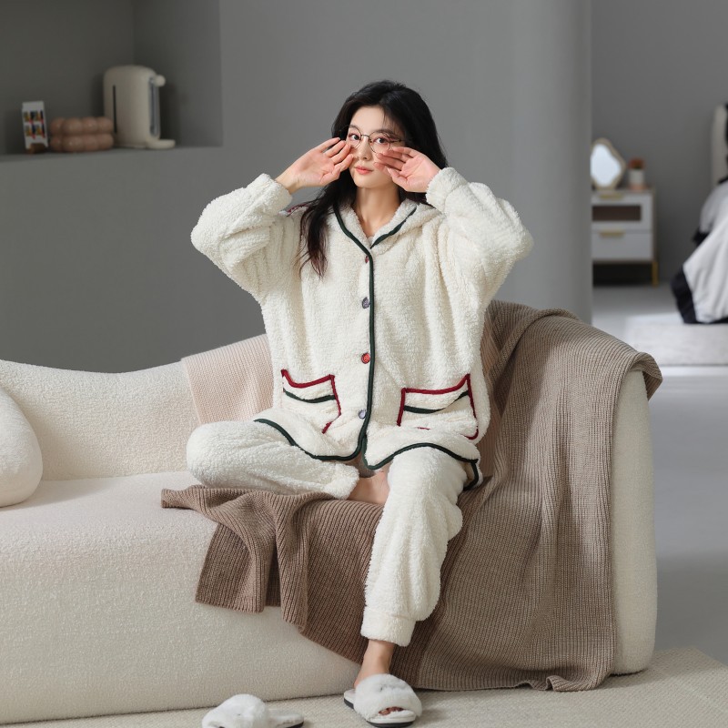 커플 잠옷 산호 양털 여성 세트 가을과 겨울 두꺼운 광택 양털 파자마 한국 캐주얼 후드 홈 의류 남성