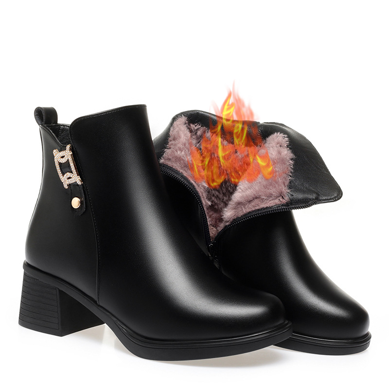 짧은 부츠 여성의 가을과 겨울 새로운 기모 부츠 중년의 어머니 신발 두꺼운 굽 여성의 부드러운 가죽 면화 신발 따뜻한 면화 부츠